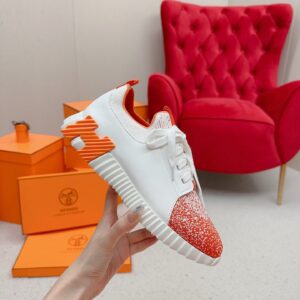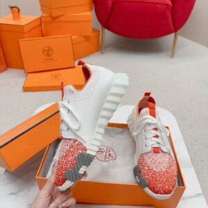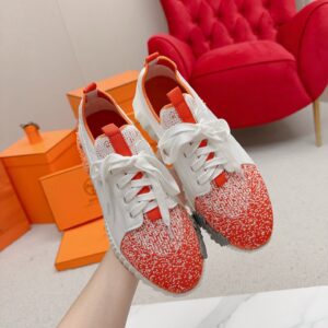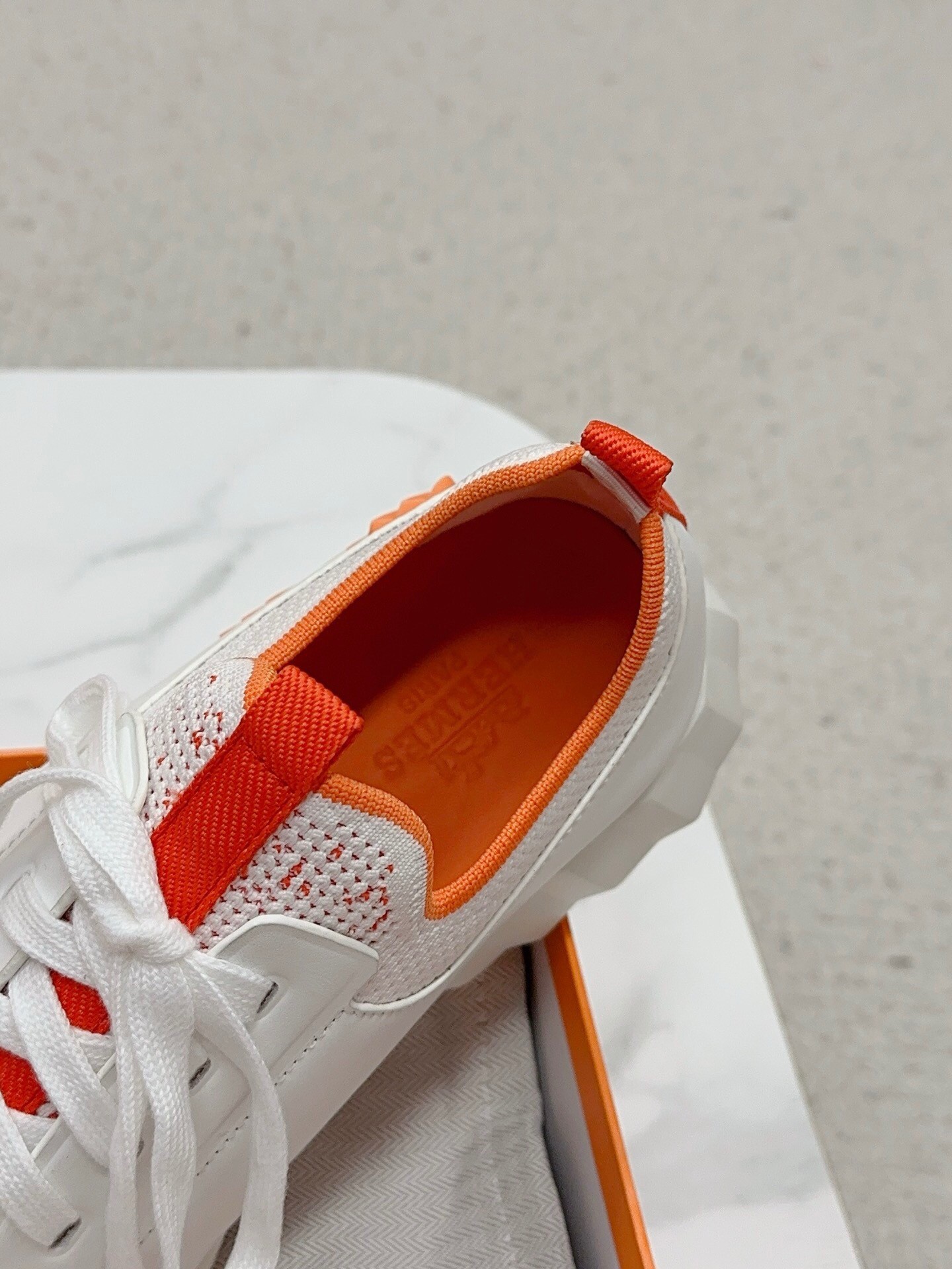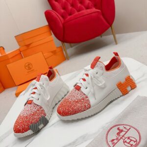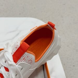 The Hermes Depart Sneakers offer a modern, sporty look with a gradient knit calfskin upper and a lightweight rubber sole with a signature orange edge. Perfect for everyday wear and long-term comfort, this sneaker is designed to be lightweight yet supportive.