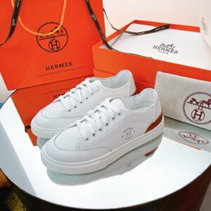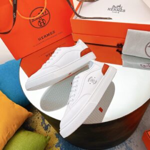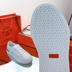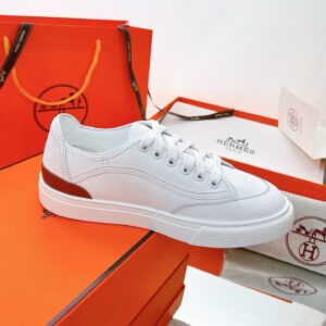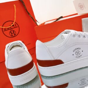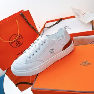 The Hermes Get Sneaker, a comfortable everyday classic sneaker. This pair of Men’s Get Sneakers comes in white complimented by brown leather detailing at the heel. It features a new “Hermès Paris” print on the outside of the shoe for the perfect modern, summer look. This is a perfect sneaker for everyday wear and is super comfy.