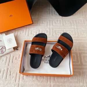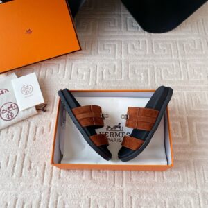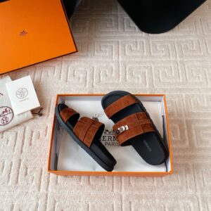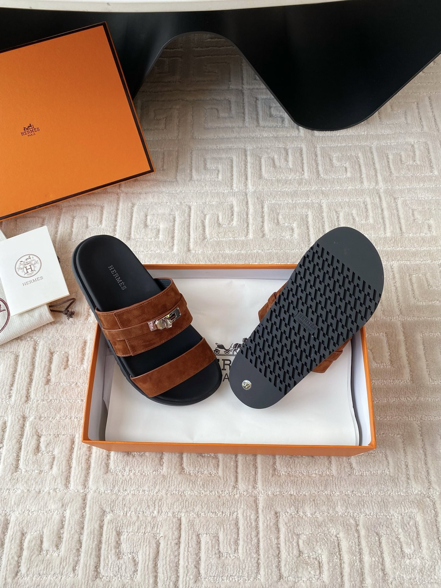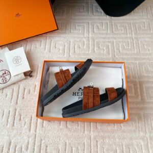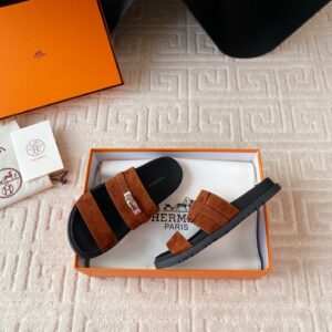 The Hermes Jackson sandal offers an elegant style with relaxed appeal. The design presents the straps, highlighting the suede calfskin. Completed by a Hermes signature on the Kelly buckle and black rubber sole, the sandal will pair easily with Bermuda shorts or jeans.