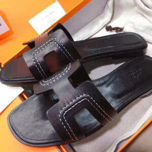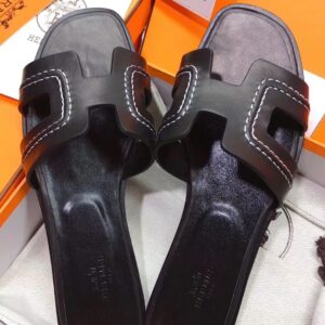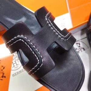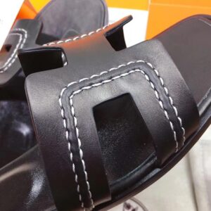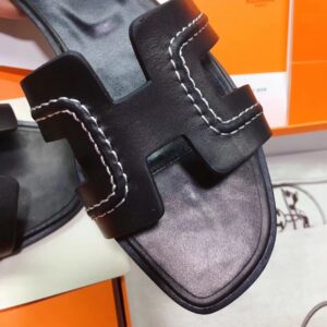 Hermes Oran Slide Sandals In Black Leather With Stitched