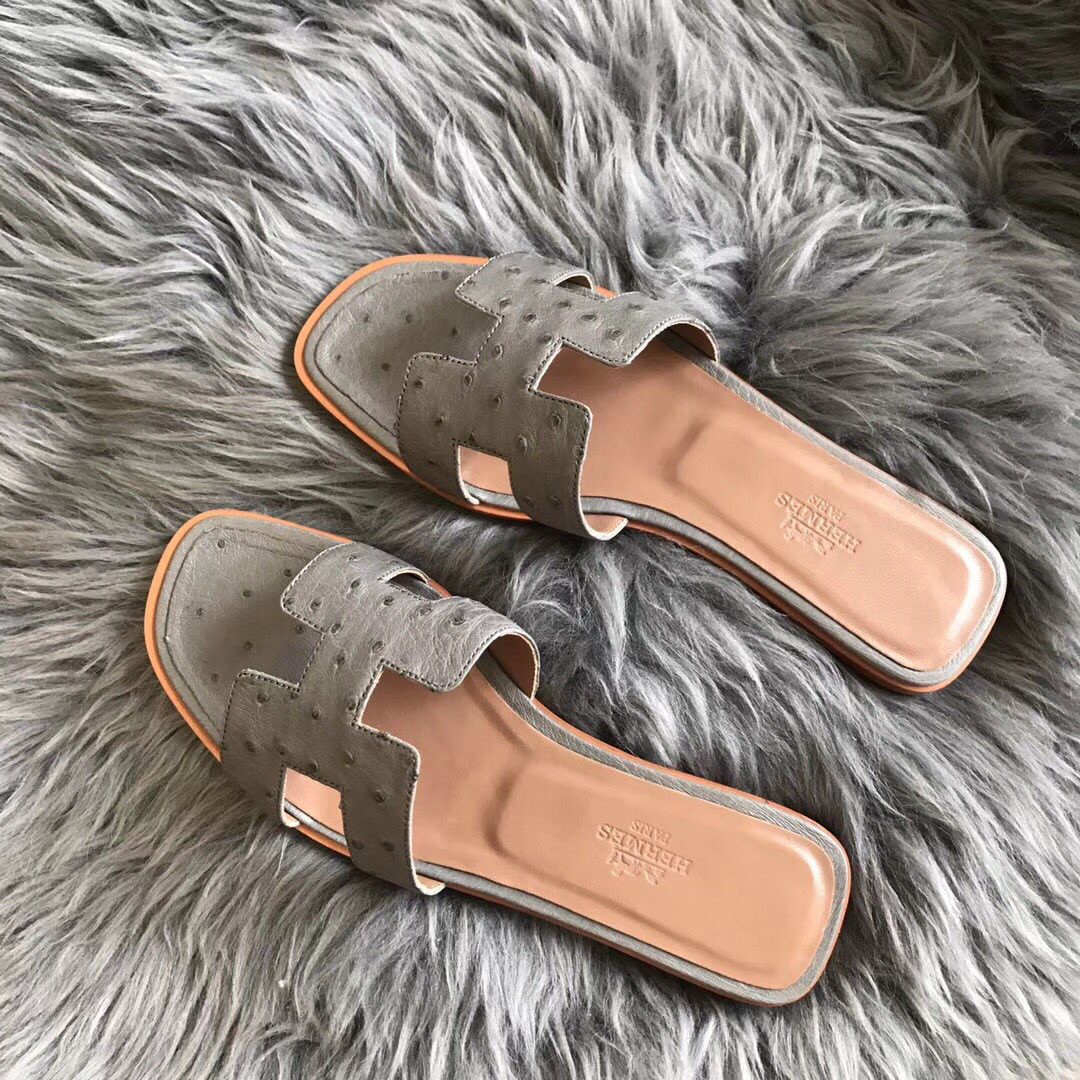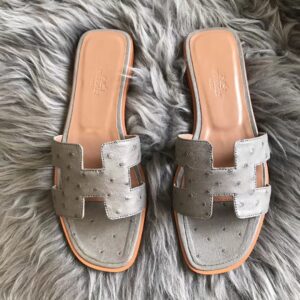 Hermes Oran Slide Sandals In Grey Ostrich Leather