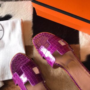 Hermes Oran Slide Sandals In Purple Shiny Niloticus Crocodile Skin