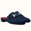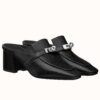 Hermes’s iconic Trocadero mule is reinterpreted this season in goatskin with an “H” detail in palladium plated. This timeless style features a monobloc construction combining several layers of leather for a thick, hard-wearing outsole and a comfortable insole.