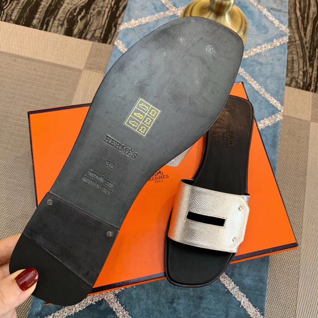 Hermes View Slide Sandals In Silver Epsom Calfskin