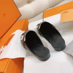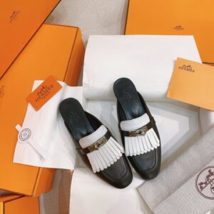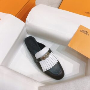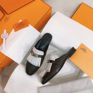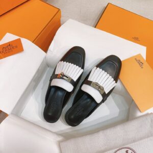Hermes Women’s Oz Mules with Fringed in Black/White Leather