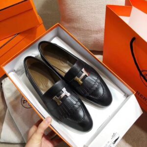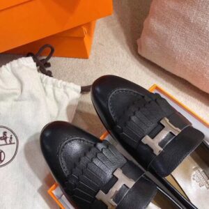Hermes reworks its coveted ‘Royal’ loafers for the new season with a comfortable rubber heel. This smooth calfskin pair is decorated with a fringed trim that tops the neat toe. We like how the palladium-plated H buckle has an aged finish to mark it out as a heritage feature.