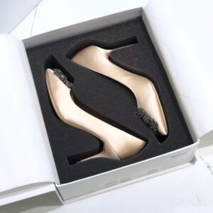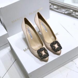 Inspired by mid-century courtesans and the paintings of Boldini, the Manolo Blahnik Hangisi pumps are universally recognised for their bejewelled brooch detailing. Crafted in beautiful silk satin with square crystal buckle, the ultra-feminine single-sole silhouette features a flattering low-cut, pointed toe and a signature metal-trimmed stiletto heel.