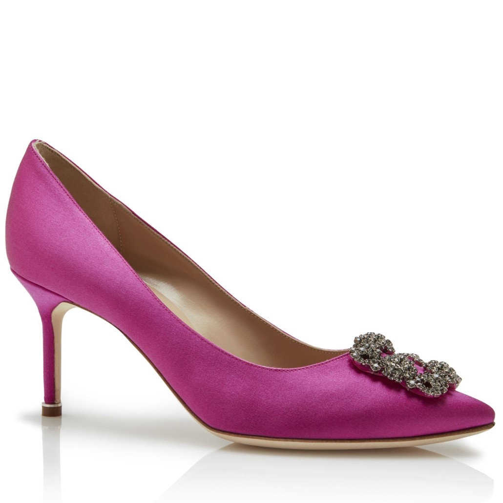 Inspired by mid-century courtesans and the paintings of Boldini, the Manolo Blahnik Hangisi pumps are universally recognised for their bejewelled brooch detailing. Crafted in beautiful silk satin with square crystal buckle, the ultra-feminine single-sole silhouette features a flattering low-cut, pointed toe and a signature metal-trimmed stiletto heel.