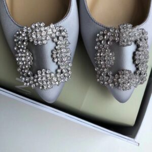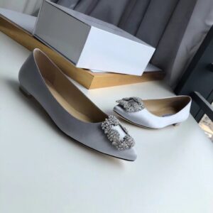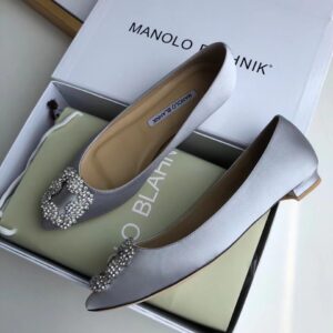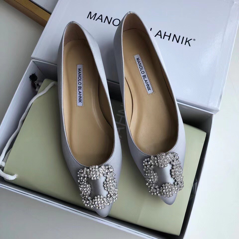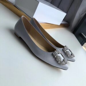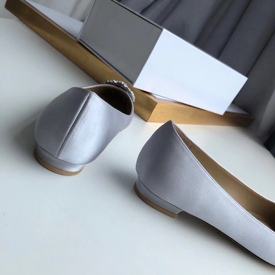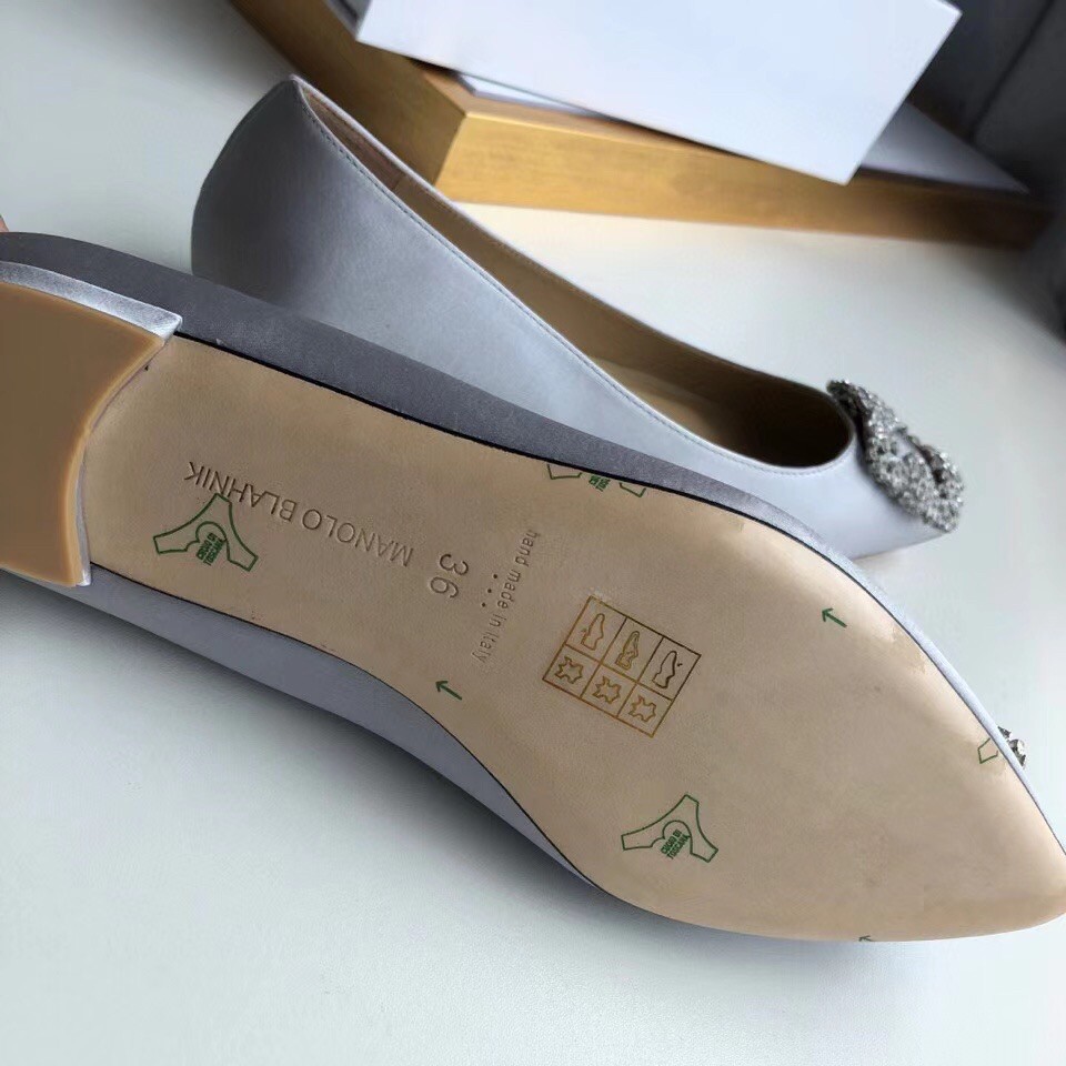 Manolo Blahnik Hangisi Flats In Grey Satin with Crystal Buckle