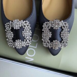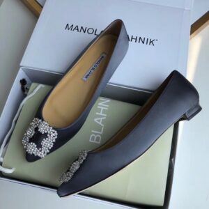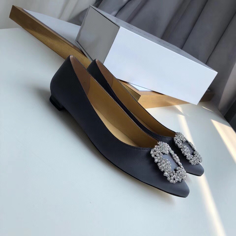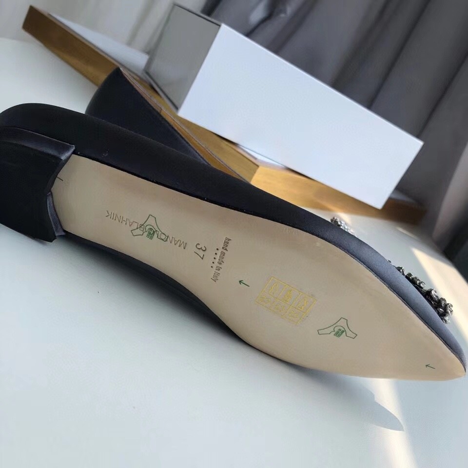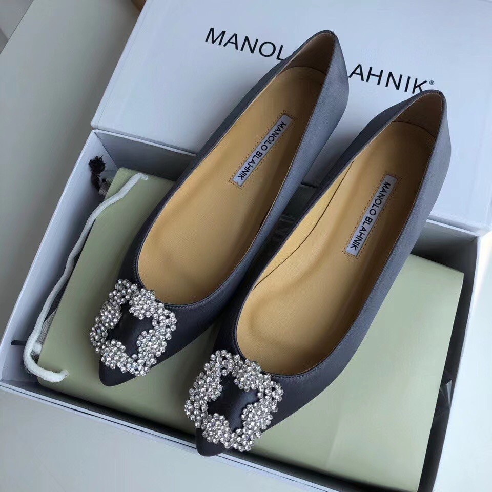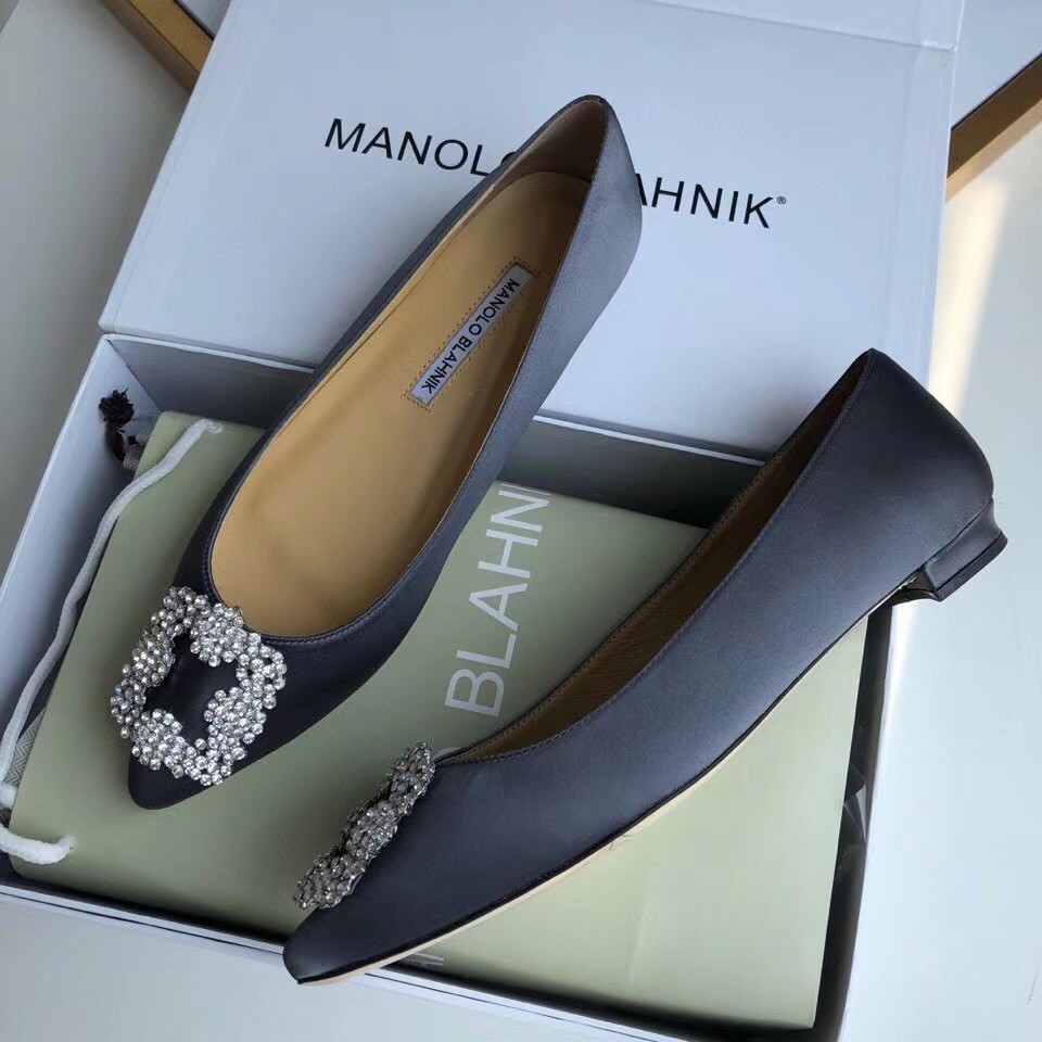 Manolo Blahnik Hangisi Flats In Navy Satin with Crystal Buckle