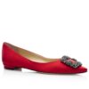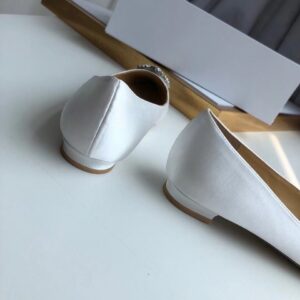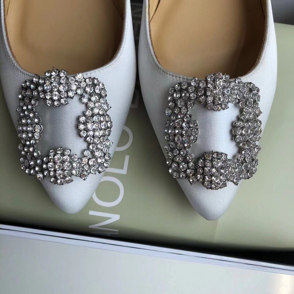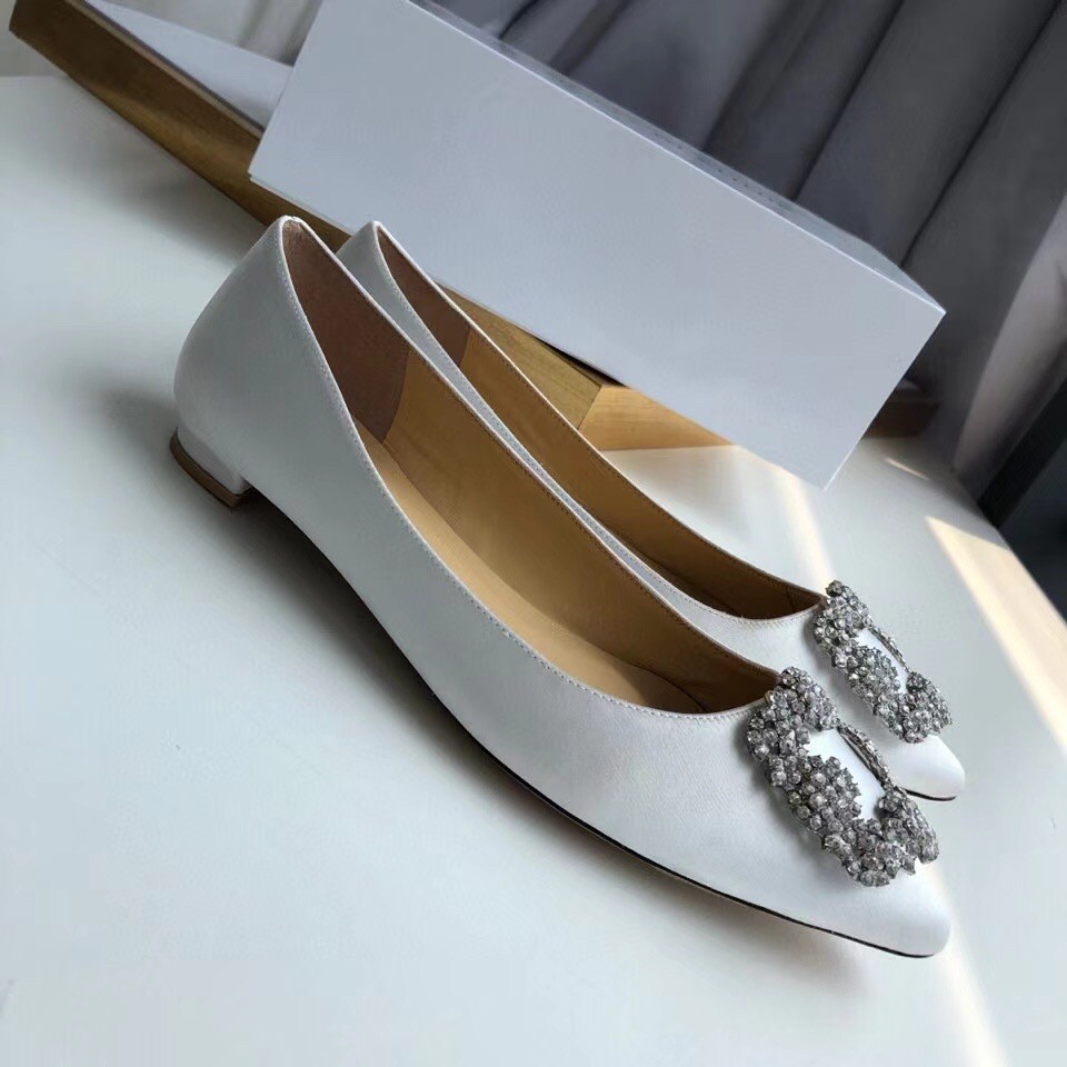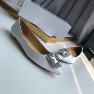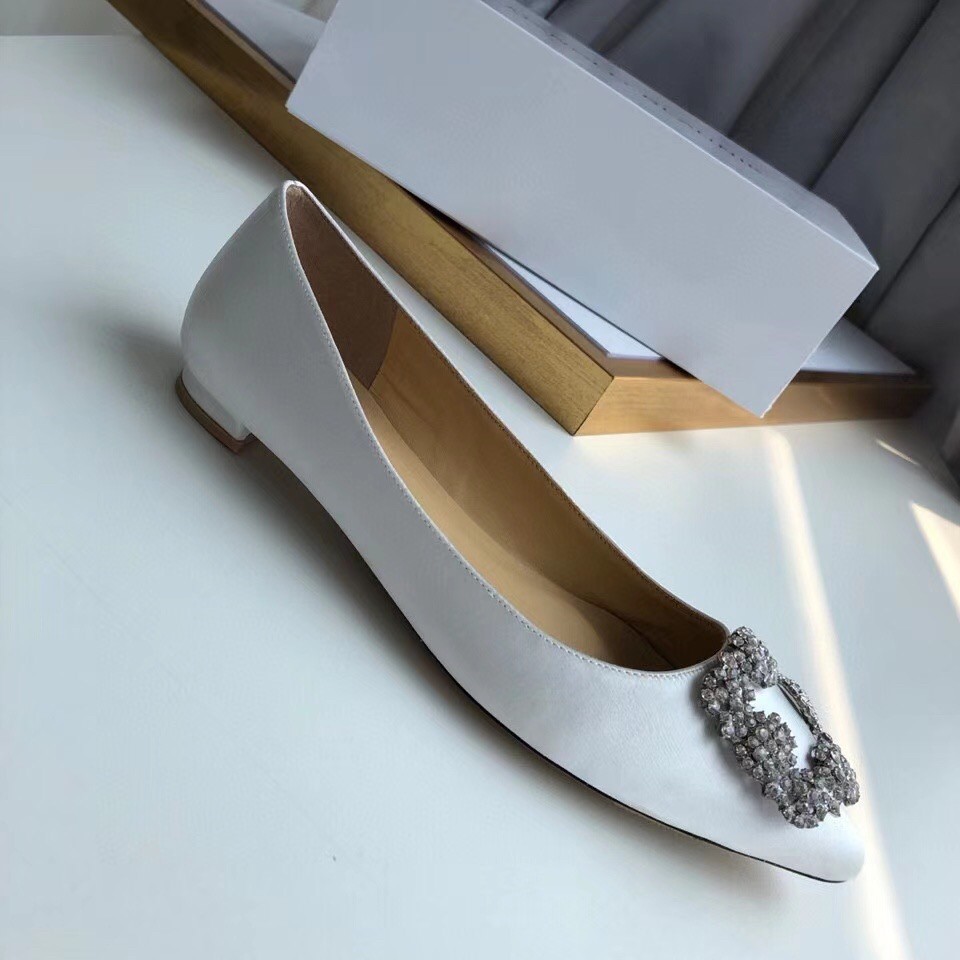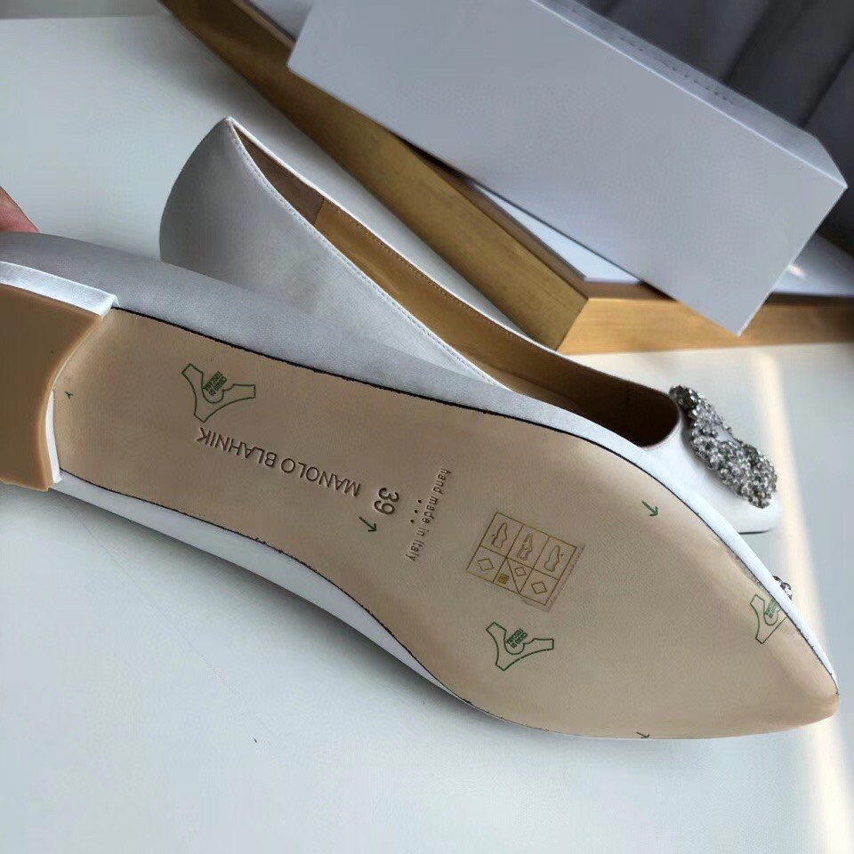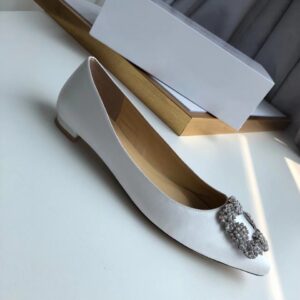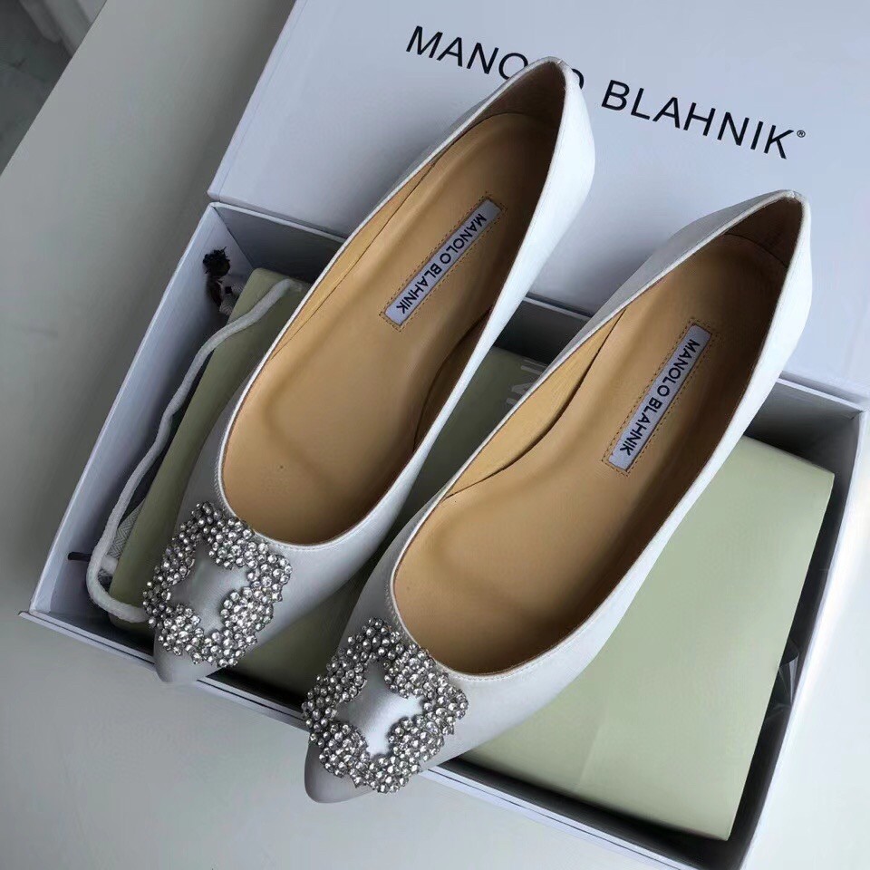 Manolo Blahnik Hangisi Flats In White Satin with Crystal Buckle