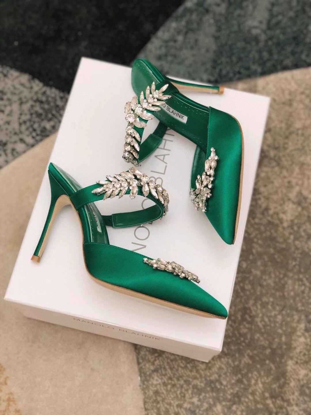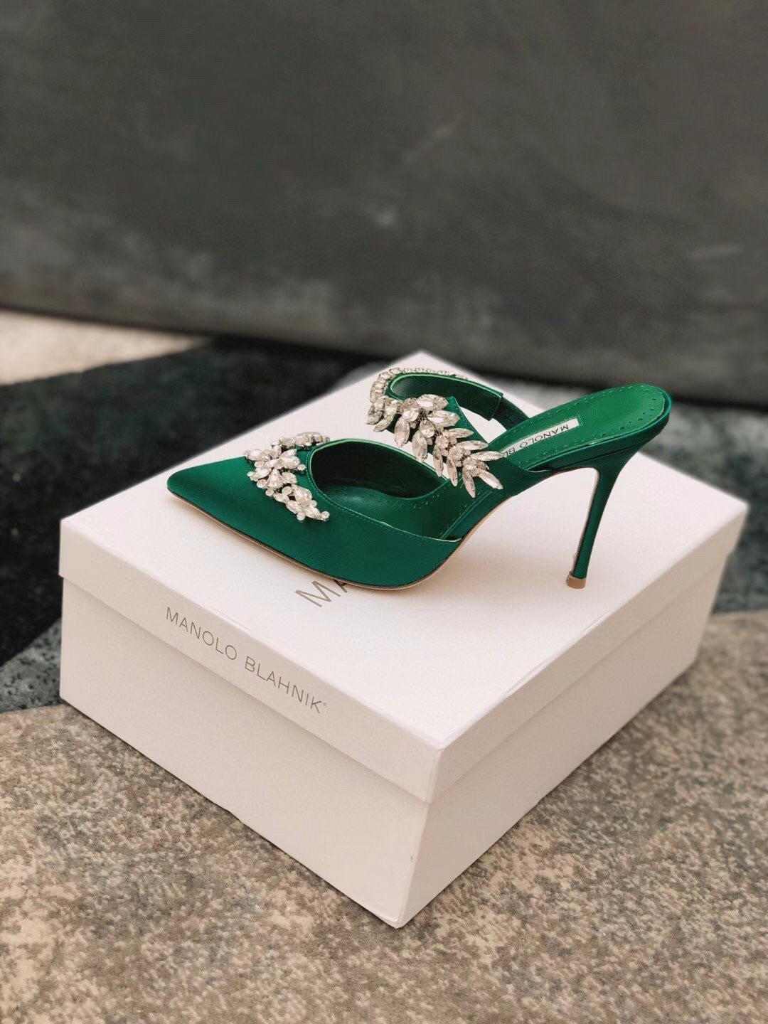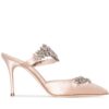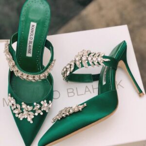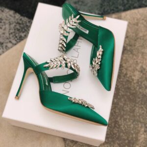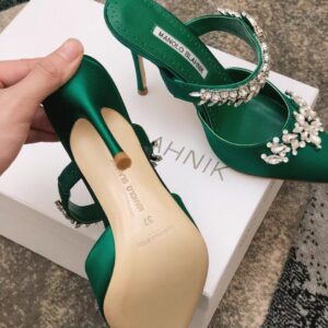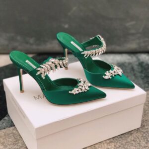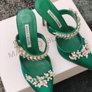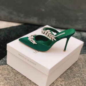 Manolo Blahnik Lurum Crystal 90mm Mules In Green Satin
