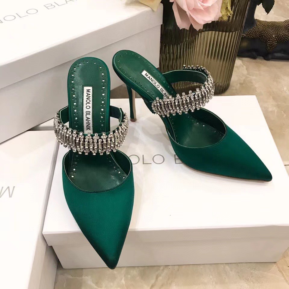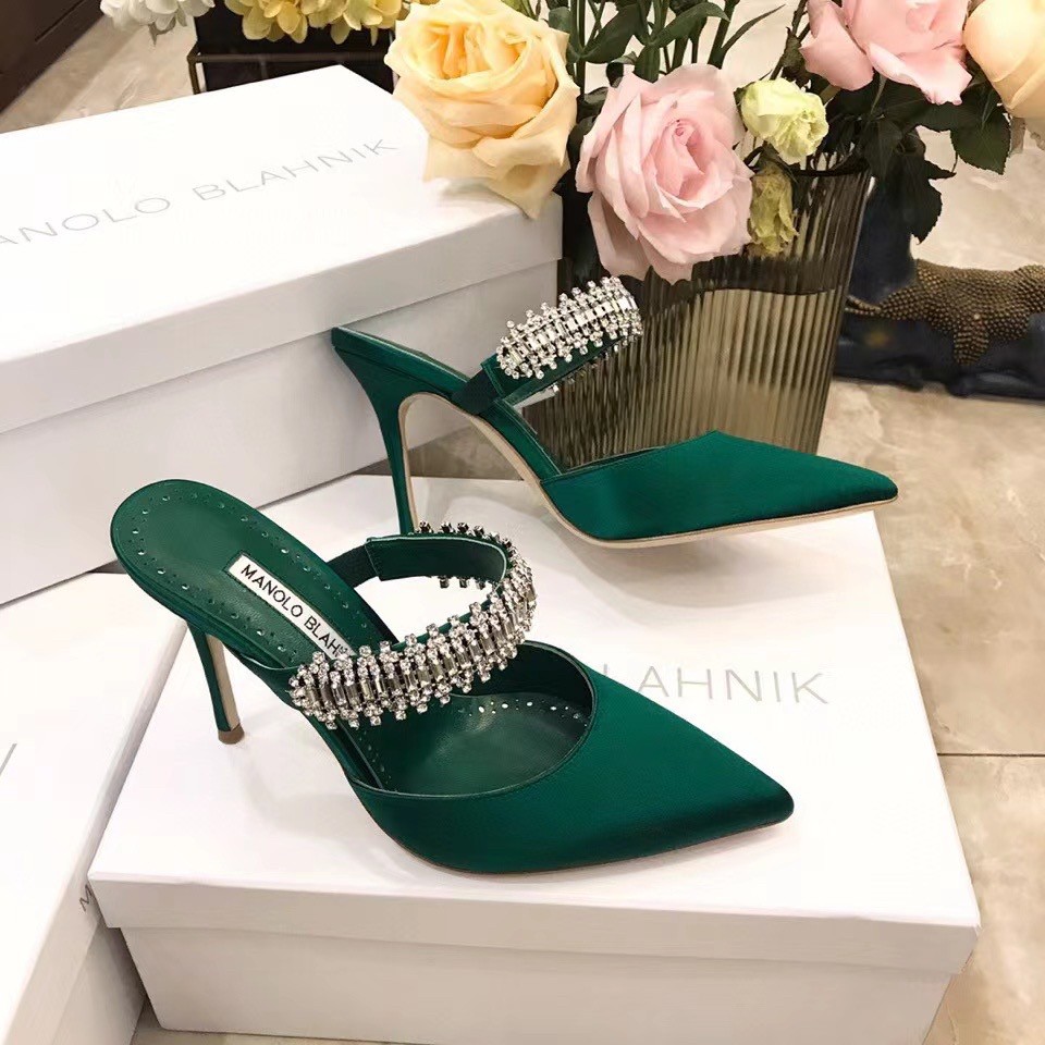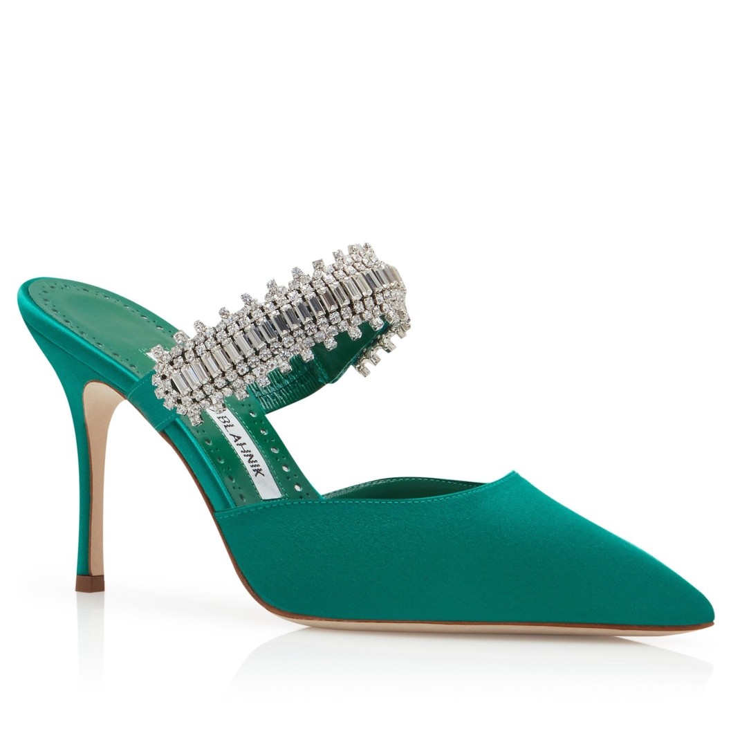 Manolo Blahnik Lutara Crystal 90mm Mules In Green Satin