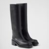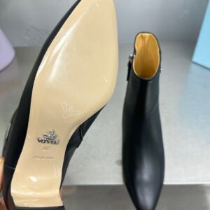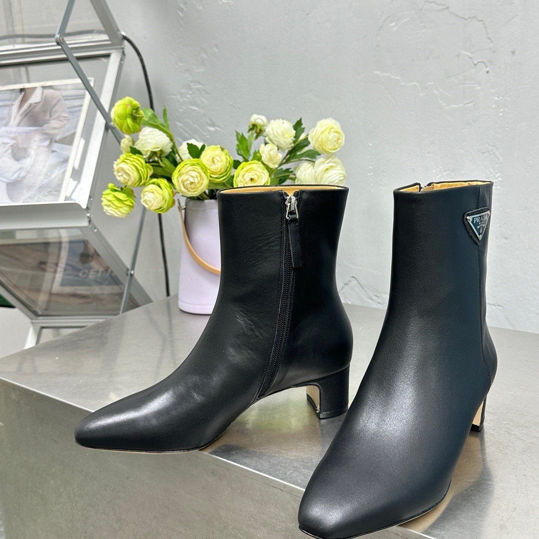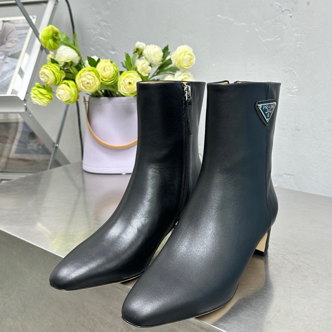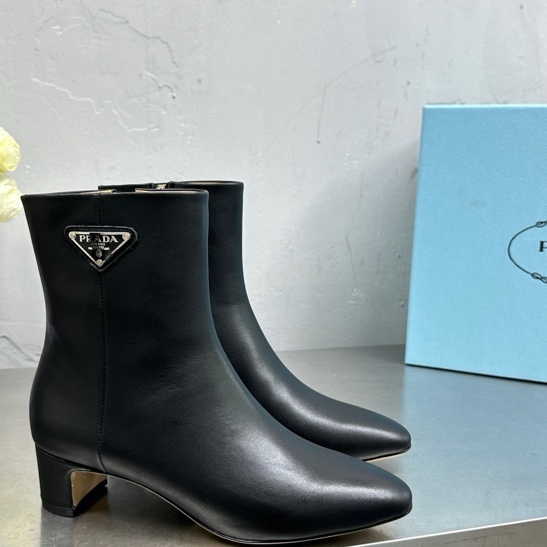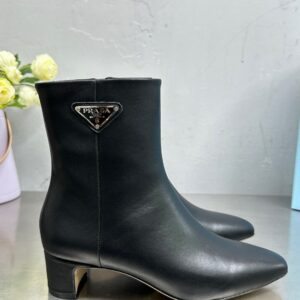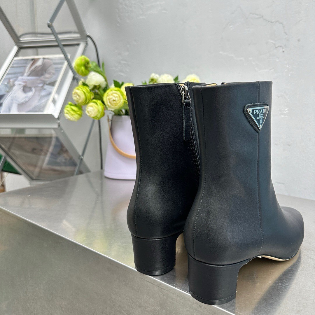 These leather booties with side zipper and leather lining have a sleek design. The iconic triangle logo, which first appeared on trunks designed by Mario Prada in 1913, decorates the footwear.