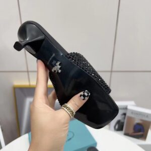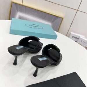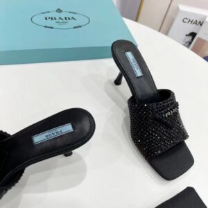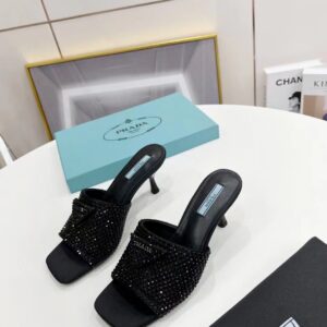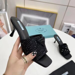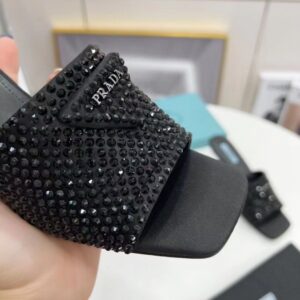 These captivating sandals from Prada will add an element of glamour to your evening looks. The mule design is placed on petite heels and the black crystal-embellished toe strap is accented with the label’s signature triangles.