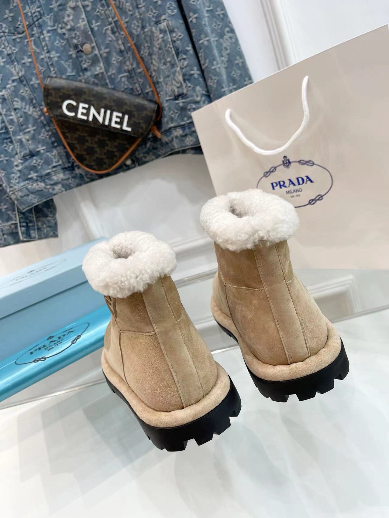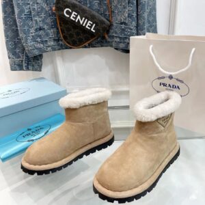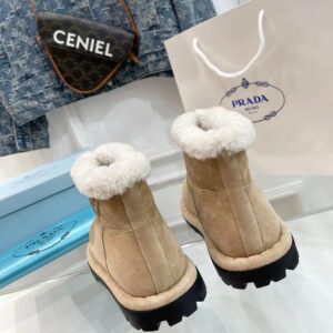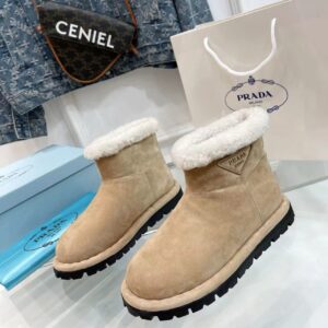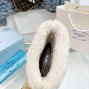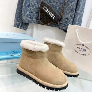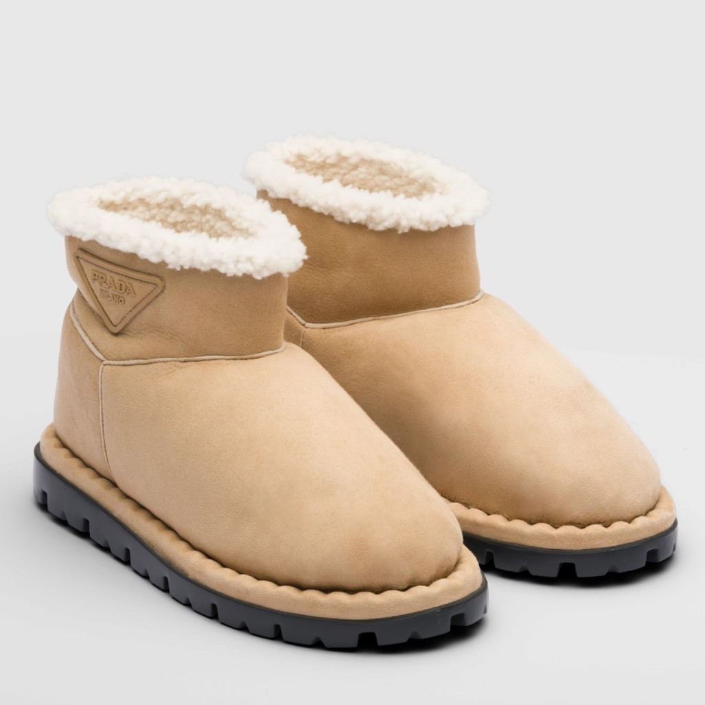 These modern booties with a versatile, minimalist design are made of shearling. The triangle logo, reimagined in always new ways, is presented here in embossed rubber.