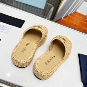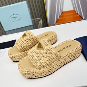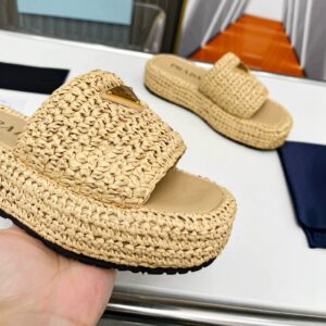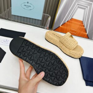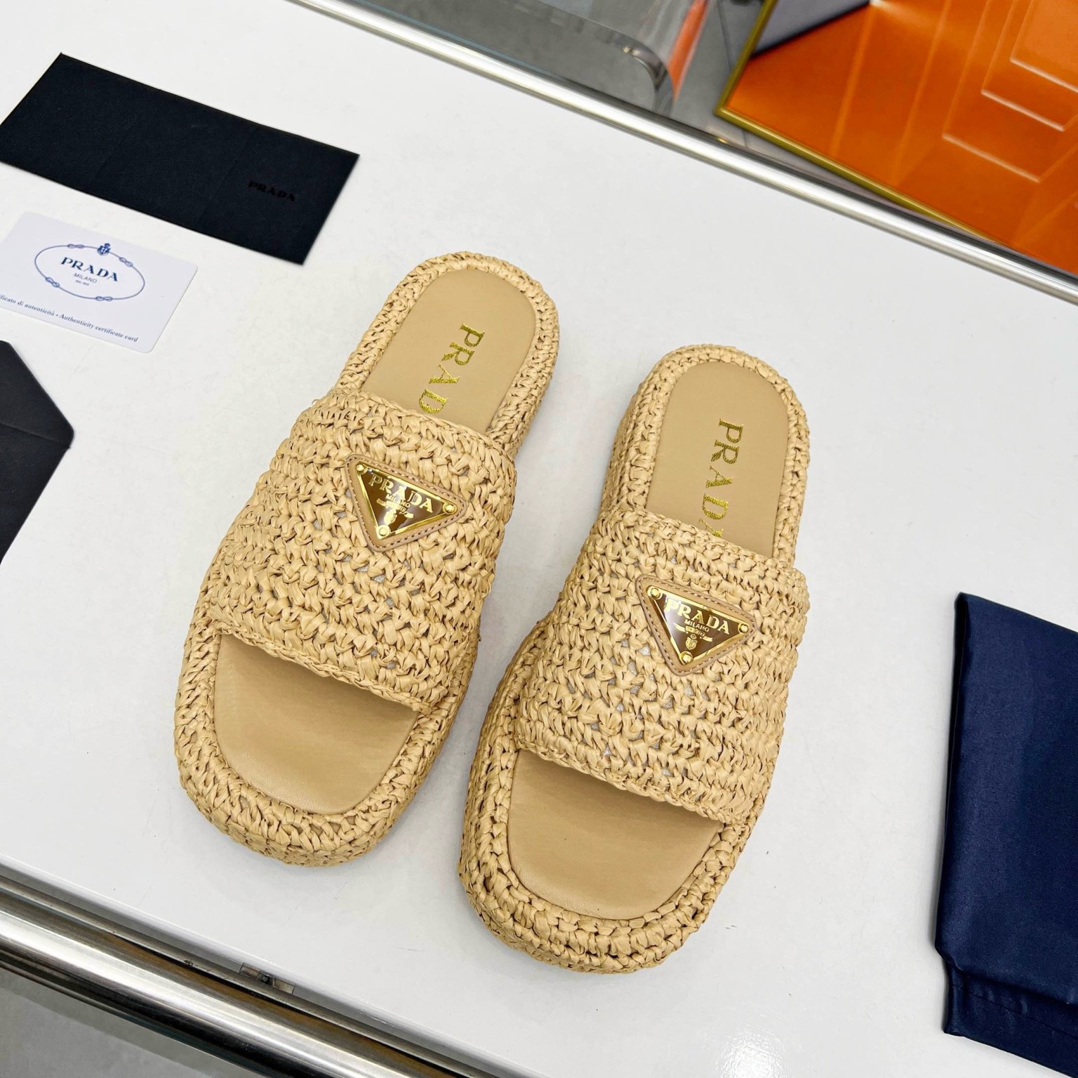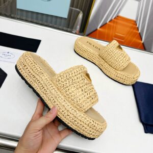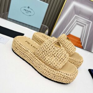 Prada Crochet Flatform Slides in Beige Raffia-effect Yarn