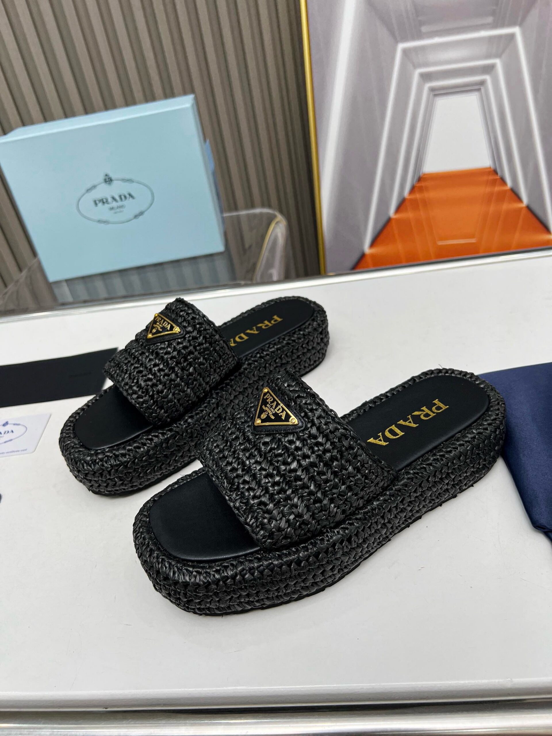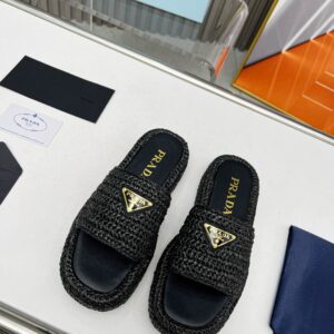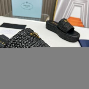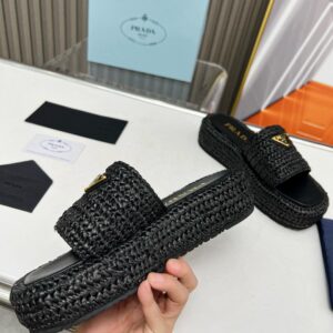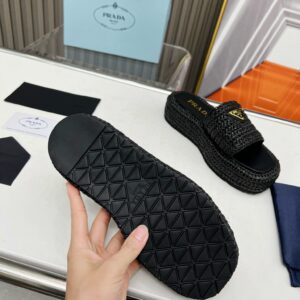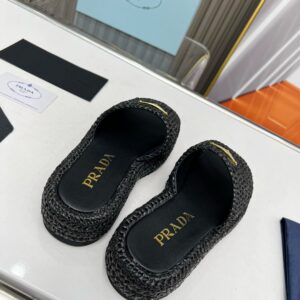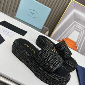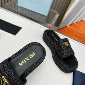 Prada Crochet Flatform Slides in Black Raffia-effect Yarn