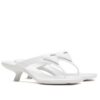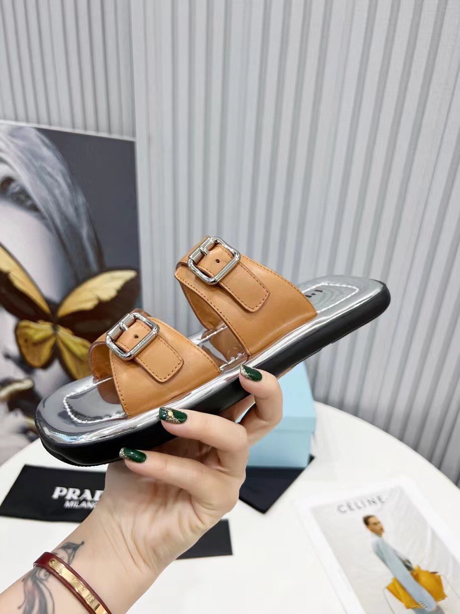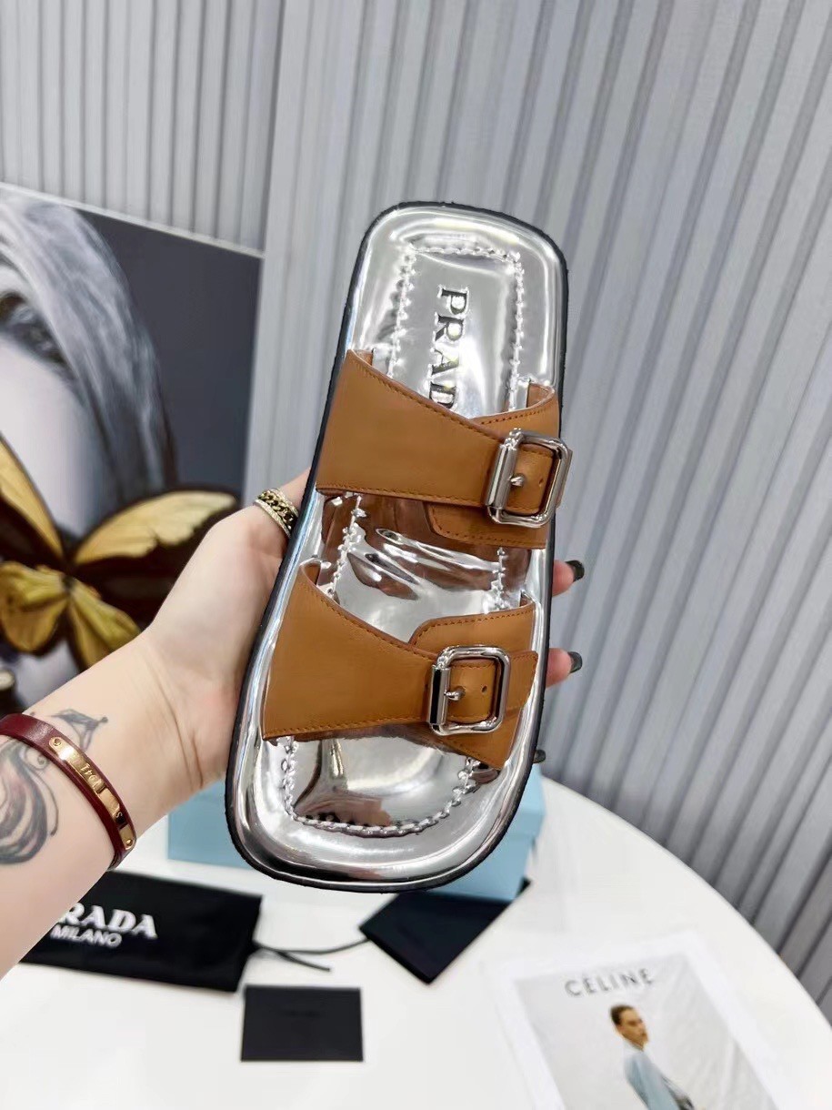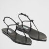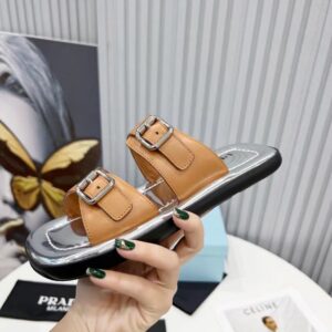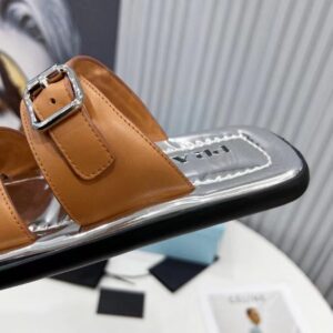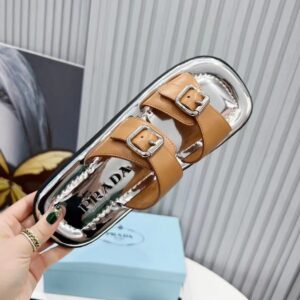 This flat rectangular sandal drawing inspiration from ’70s shapes recalls an historic archive style and plays with graphic and geometric elements that have always characterized Prada imagery. The insole comes in silver metallic leather, adding an unusual contrast. The design with metal buckles is completed by the innovative, ultra-light EVA sole.