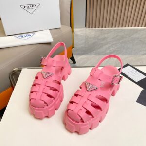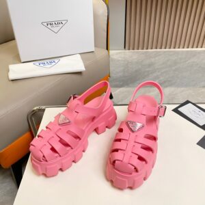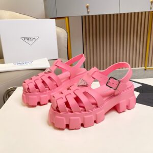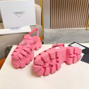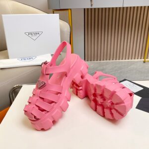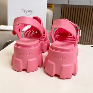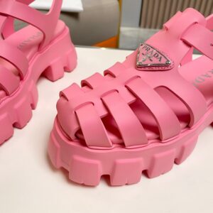 The chunky yet lightweight design of the iconic Monolith sole made of rubber is an expression of a timeless design, monolithic and unique, that reimagines Prada’s dual soul with a modernist twist. Made of rubber for a fun, contemporary look, the silhouette reinterprets retro beach footwear in a totally new way that reflect Prada’s hybrid soul.