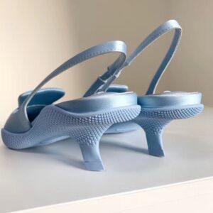 Revisiting a design from the Prada archives of the ’90s, the rubber shell sole envelops the upper of these nylon gabardine slingback pumps, creating a hybrid silhouette that blends a feminine pointy shape and sporty references such as the voluminous tongue decorated with the screen-printed Prada logo. A distinctive element of the Spring Summer 2021 collection is the comma heel, inspired by styles from the same decade.