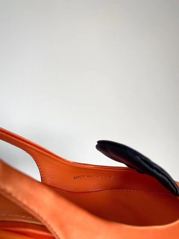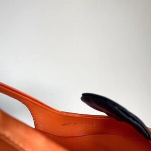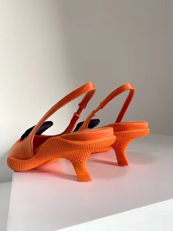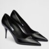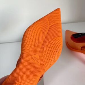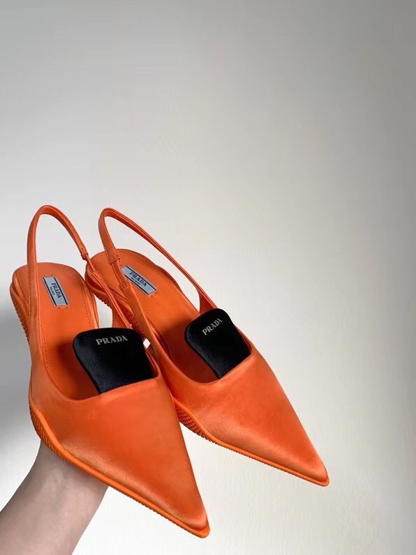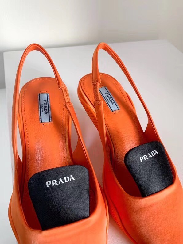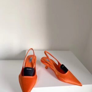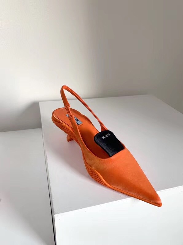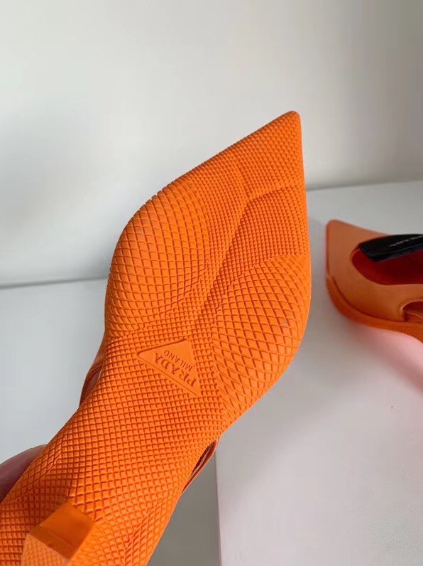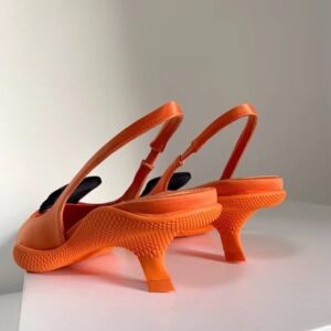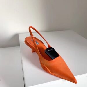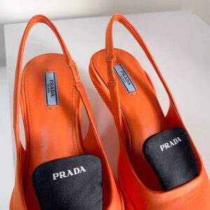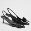 Revisiting a design from the Prada archives of the ’90s, the rubber shell sole envelops the upper of these nylon gabardine slingback pumps, creating a hybrid silhouette that blends a feminine pointy shape and sporty references such as the voluminous tongue decorated with the screen-printed Prada logo. A distinctive element of the Spring Summer 2021 collection is the comma heel, inspired by styles from the same decade.