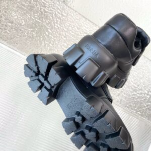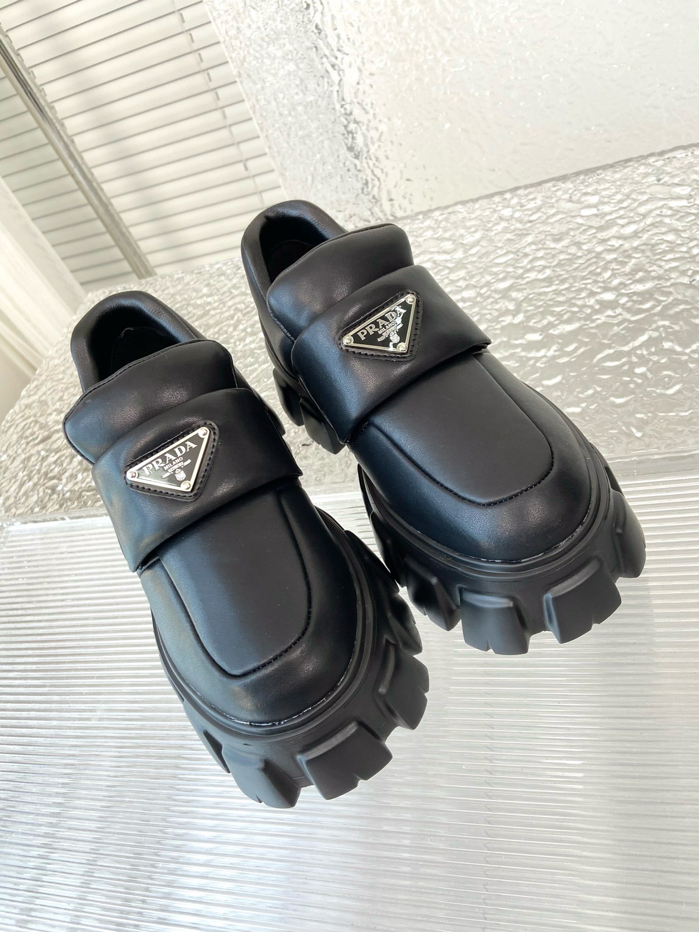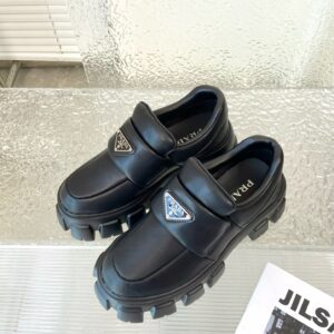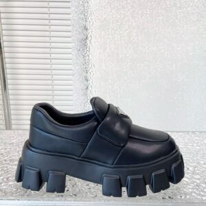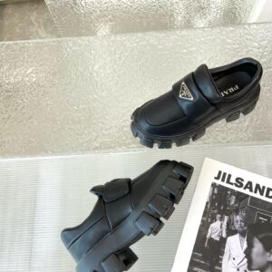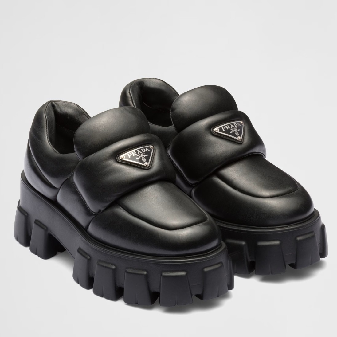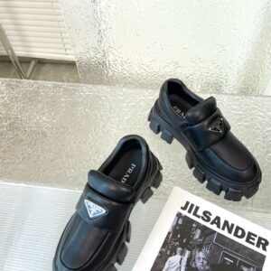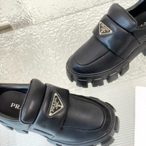 These loafers with a hybrid design highlight Prada’s duality concept, fundamental in the aesthetic of the brand. The maxi modernist sole with a unique, monolithic design is paired with an upper in soft padded nappa leather with a sophisticated look. A contrasting yet harmonious soul characterizes the shoe that unites diametrically opposed images to create timeless silhouettes.