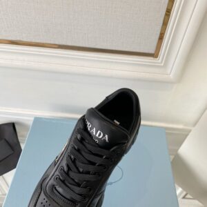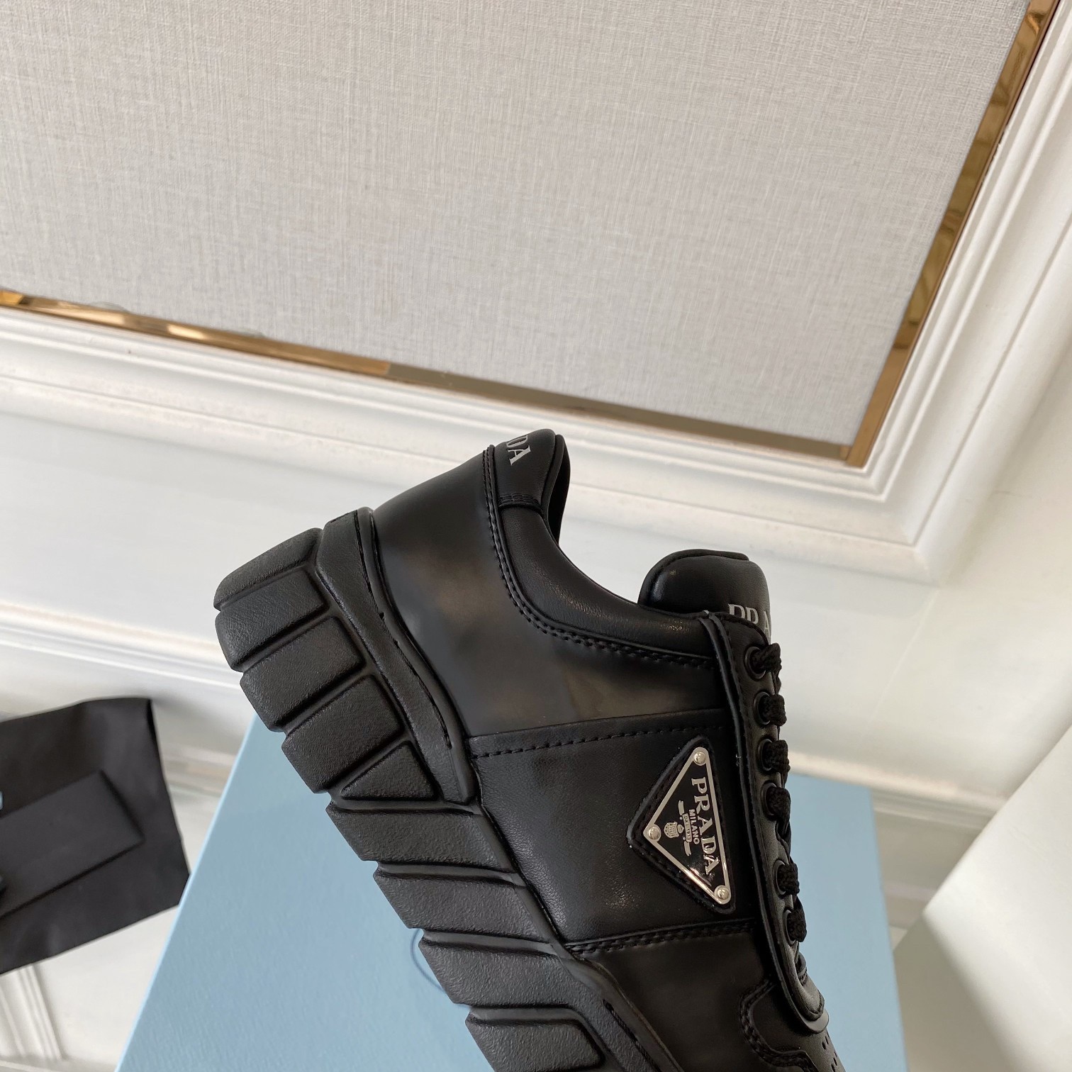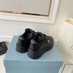 These luxury leather sneakers are defined by a modern design. Voluminous rubber soles provide a sporty allure, while an iconic, enameled-metal triangle logo completes the look.