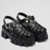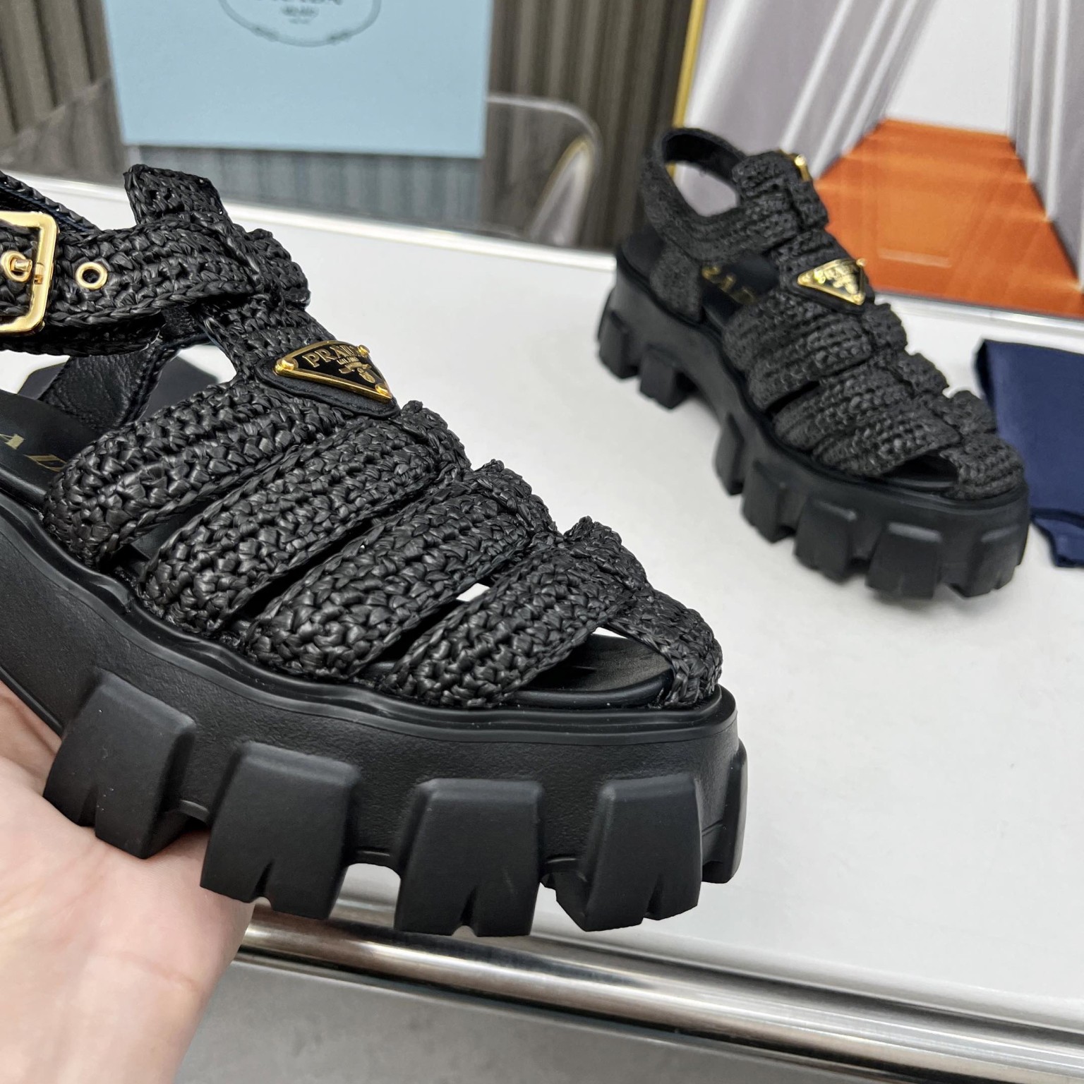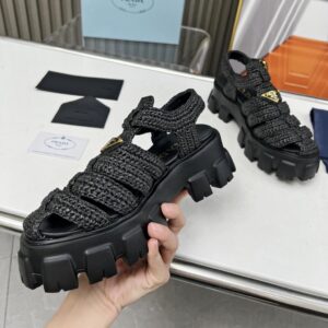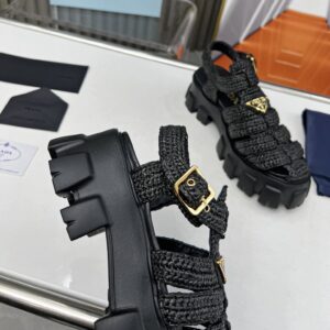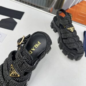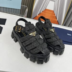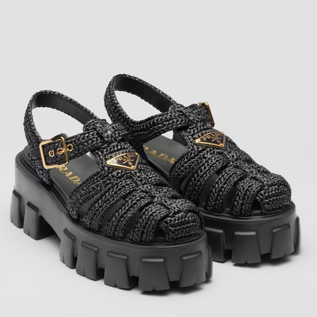 Prada Monolith Crochet Cage Sandals in Black Raffia Fabric