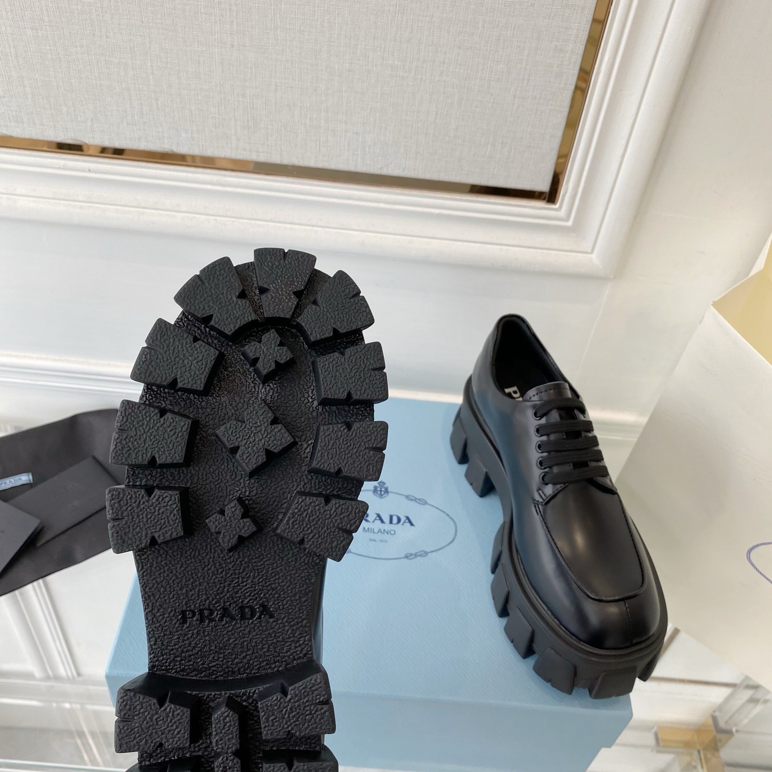 – Prada Milano logo embossed on the tongue