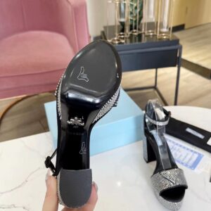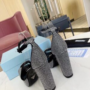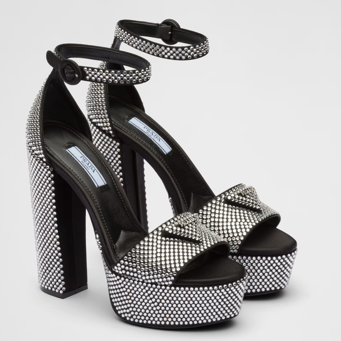 Bold allure characterizes these high-heeled satin platform sandals studded with crystals that create a play of light and iridescent reflections on the surface. The triangle logo appearing as a slightly padded leather detail adds a modernist note.