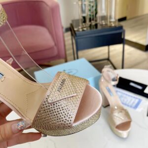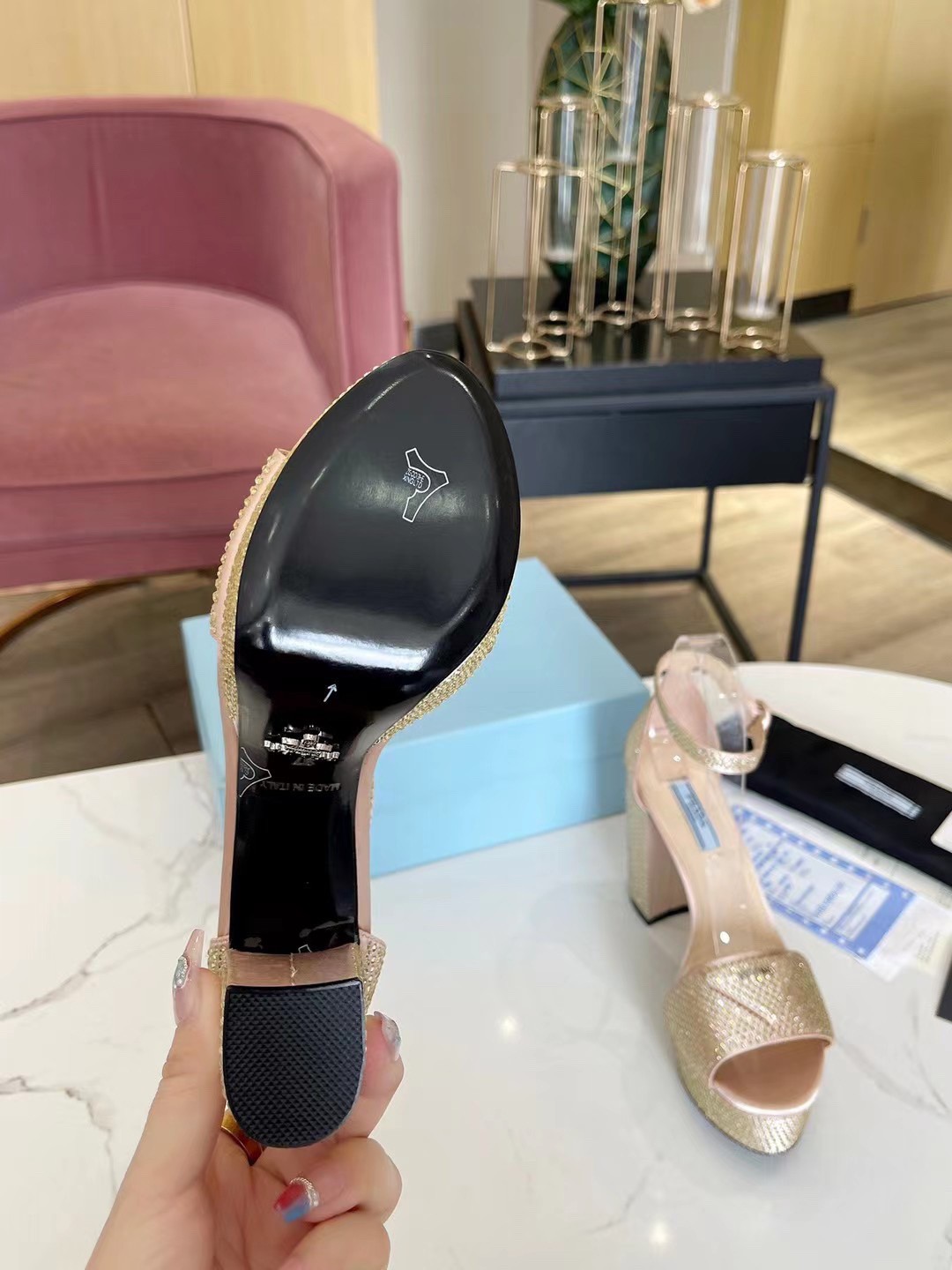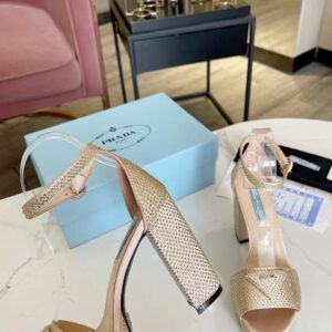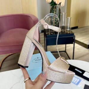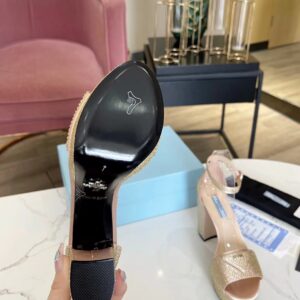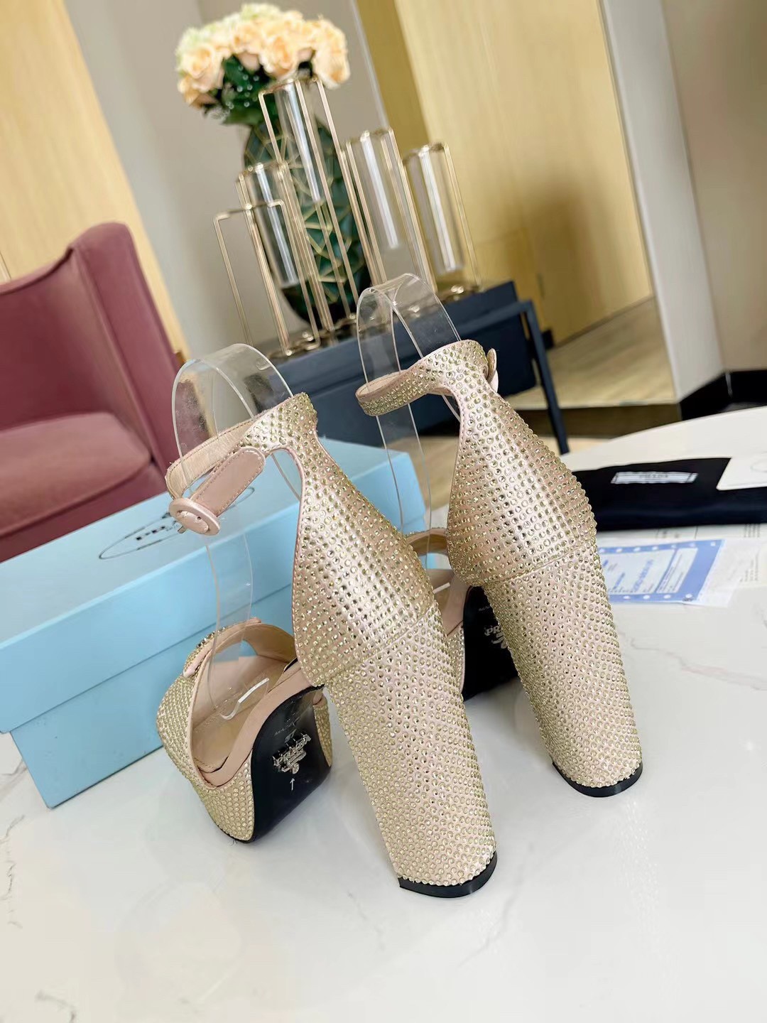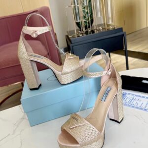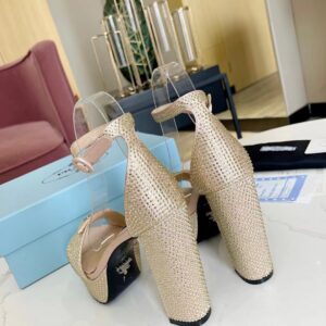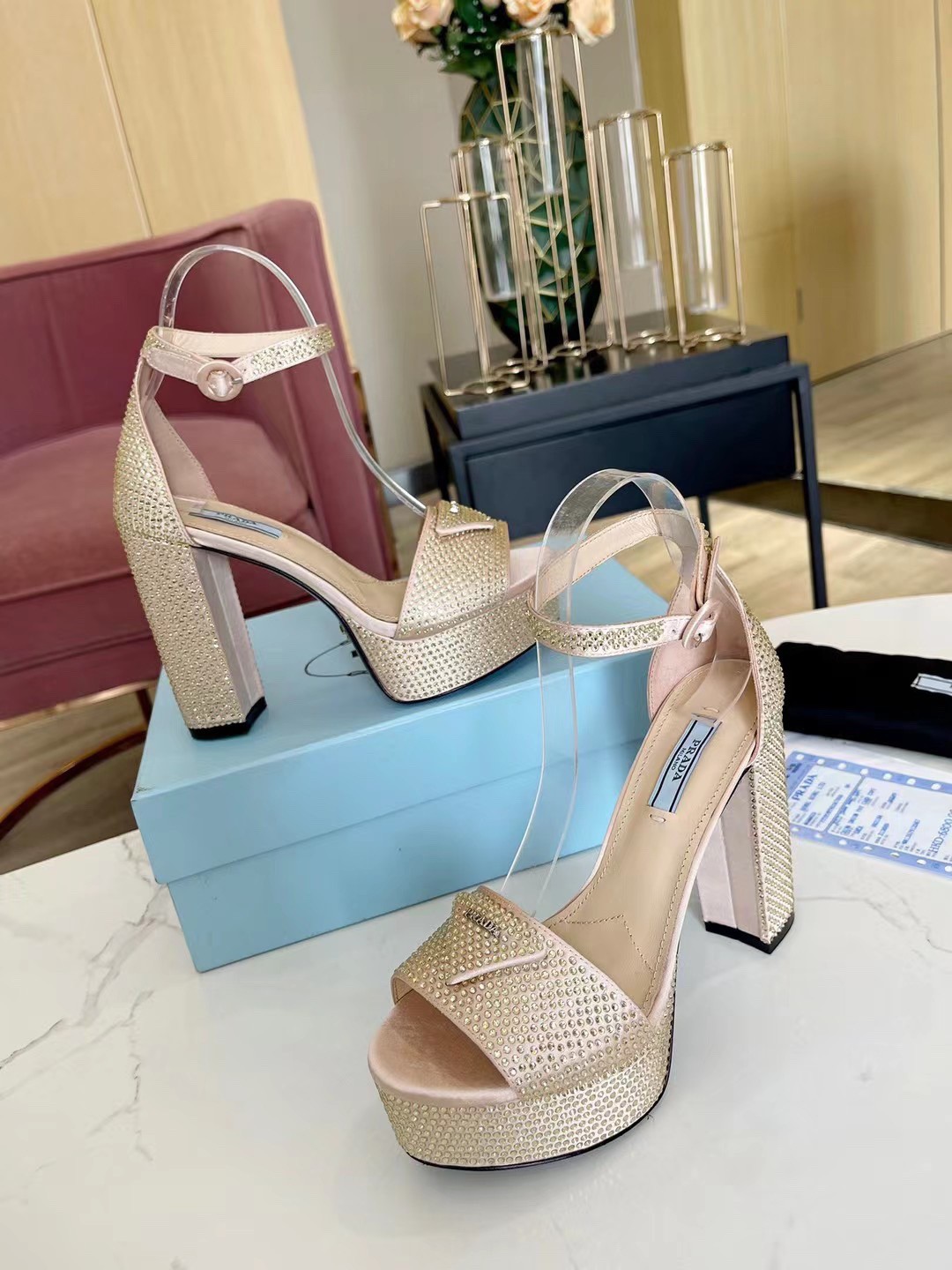 Bold allure characterizes these high-heeled satin platform sandals studded with crystals that create a play of light and iridescent reflections on the surface. The triangle logo appearing as a slightly padded leather detail adds a modernist note.