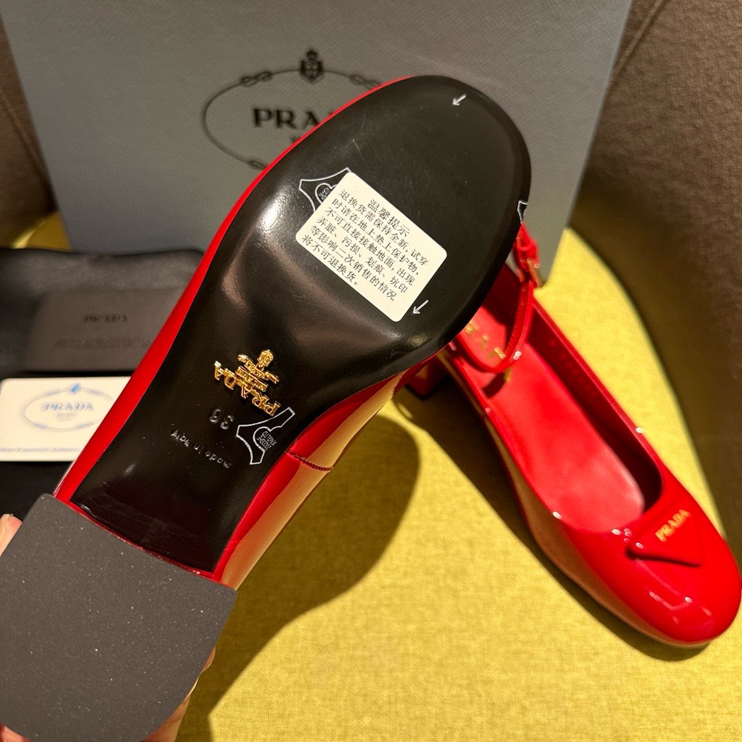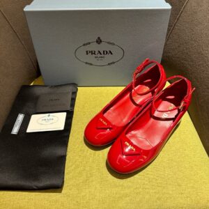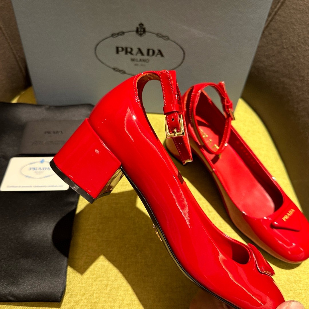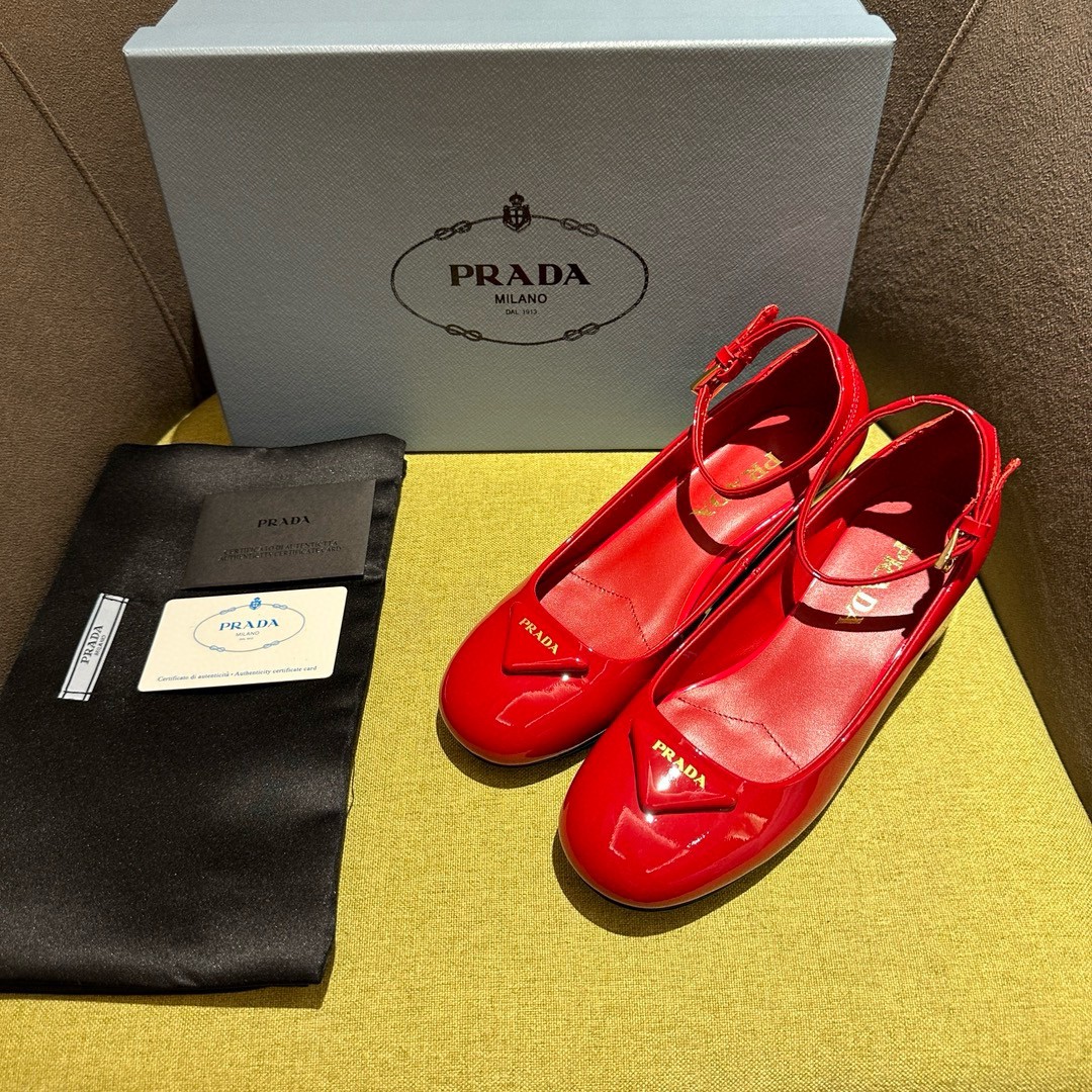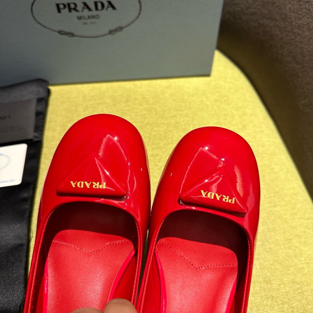 The feminine design of these sophisticated pumps is embellished by the glossy finish of patent leather that introduces a contemporary touch to the timeless silhouette. The enameled metal triangle logo completes the shoe with its iconic signature.