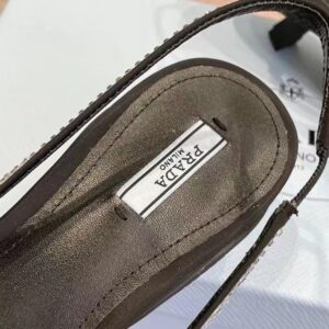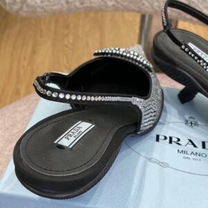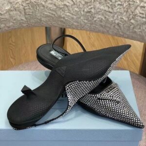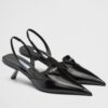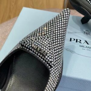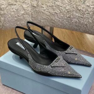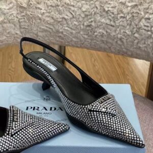 These slingback pumps with comma heel are made of satin studded with crystals that create a play of light and iridescent glimmers on the surface. Revisiting a design from the Prada archives of the nineties, a rubber sole envelops the upper, creating a hybrid silhouette that blends a feminine pointy silhouette and sports references. New interpretations for the iconic triangle, transformed into a slightly padded detail.