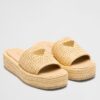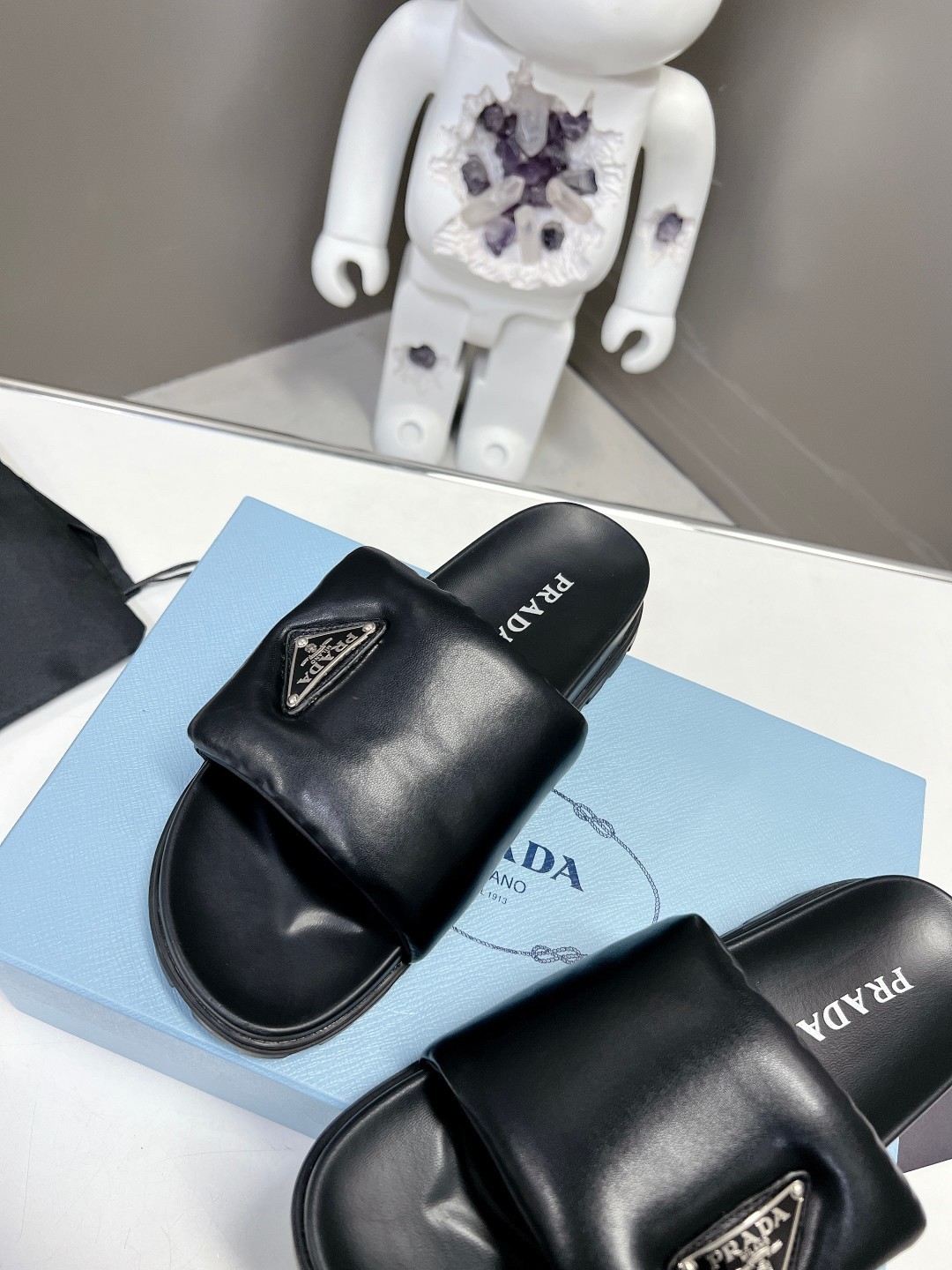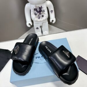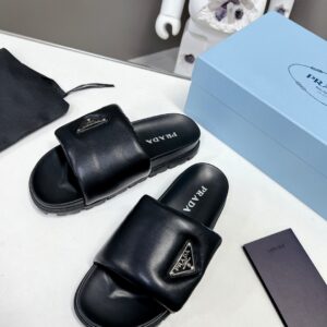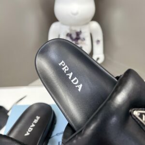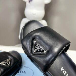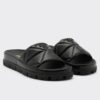 Prada explores nostalgic influences in these soft nappa leather slides. Inspired by minimalist ’90s designs, they’re adorned with the brand’s enamelled triangle logo plaque, referencing archival codes.