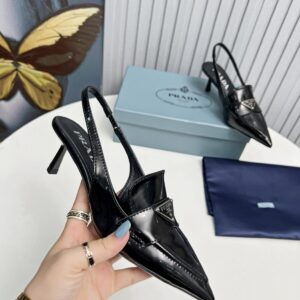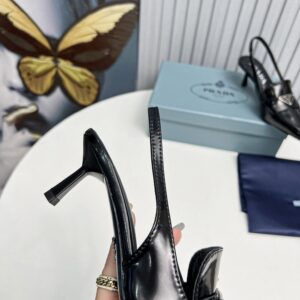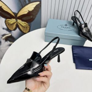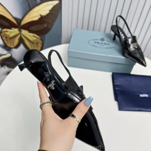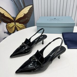 A motif which first appeared in 1913 on trunks designed by Mario Prada. These tapered, sinuous patent leather slingbacks with masculine touches are embellished with the iconic enameled metal triangle logo that stands out on the upper.