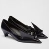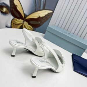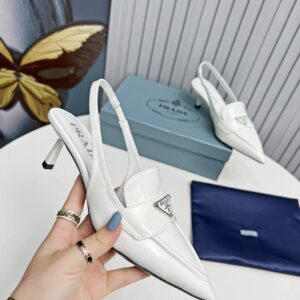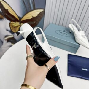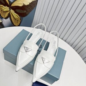A motif which first appeared in 1913 on trunks designed by Mario Prada. These tapered, sinuous patent leather slingbacks with masculine touches are embellished with the iconic enameled metal triangle logo that stands out on the upper.