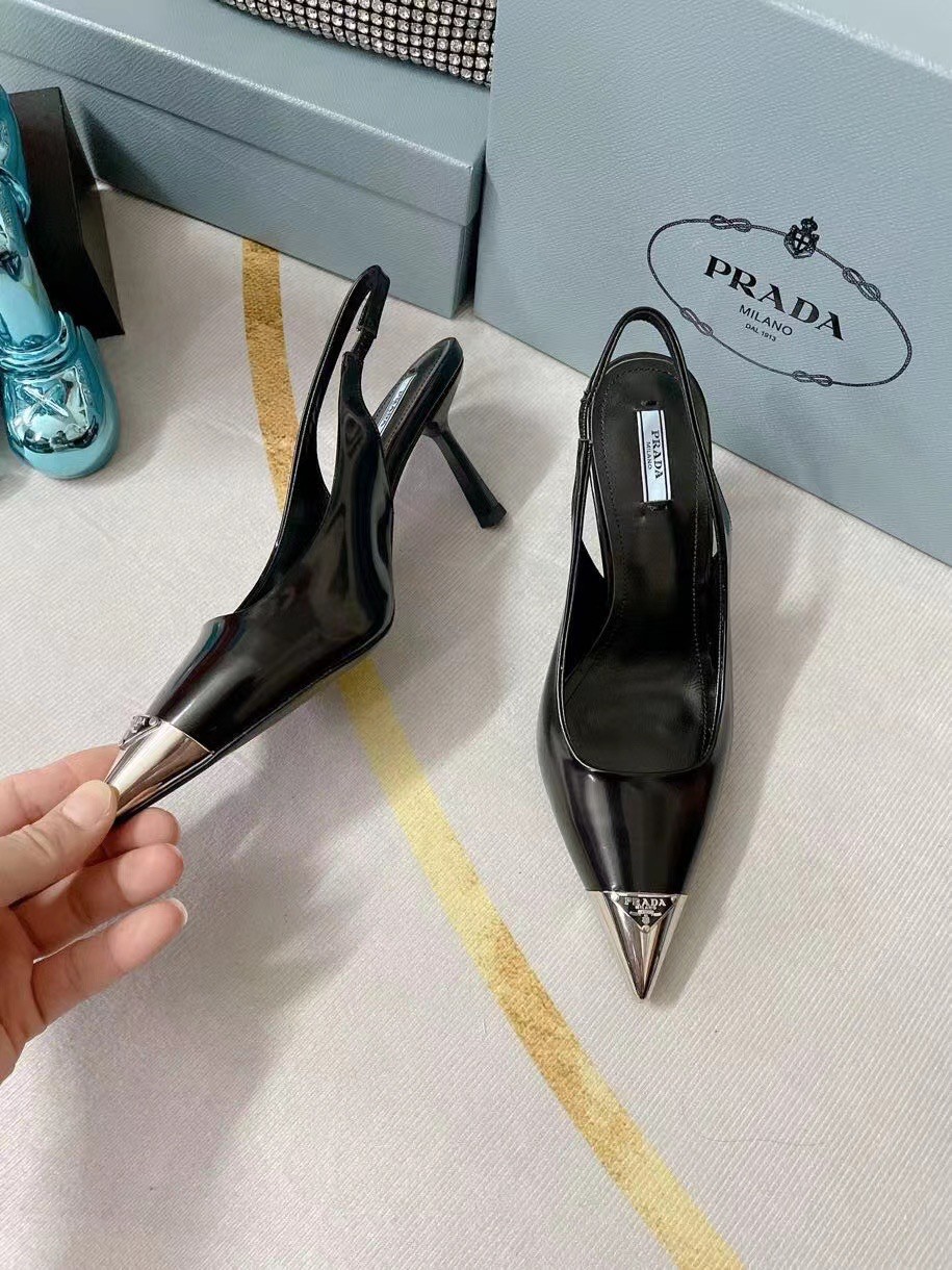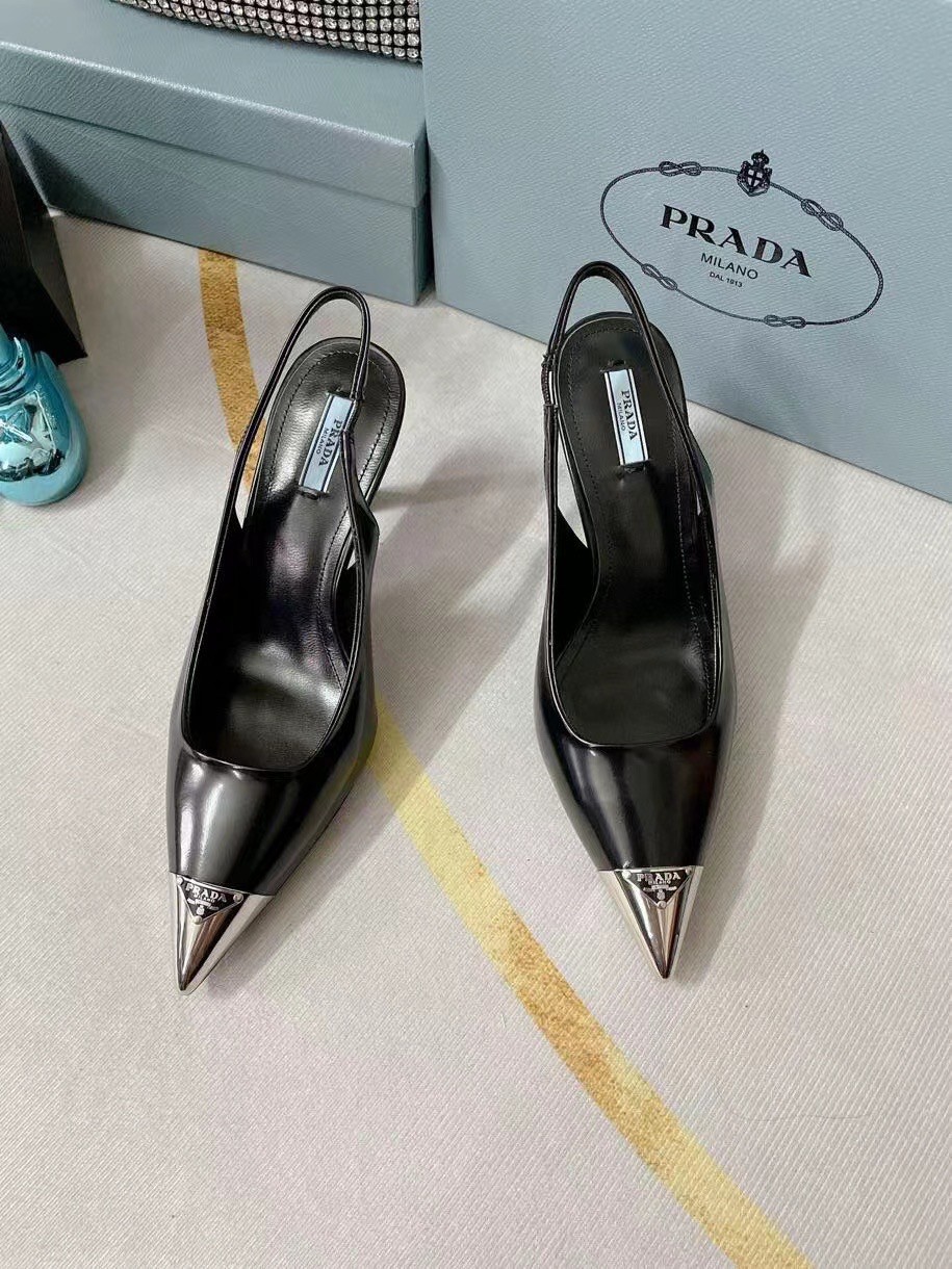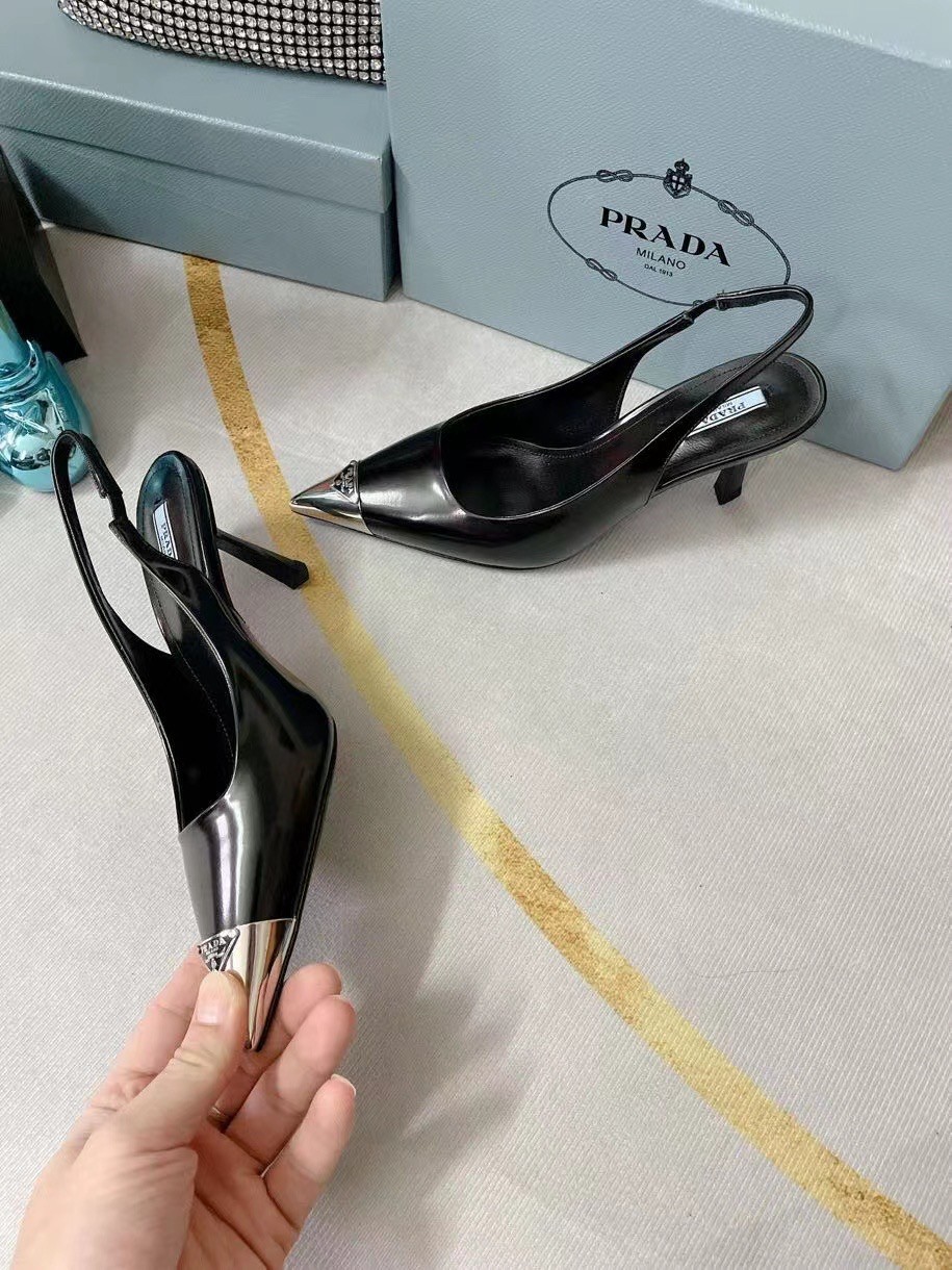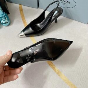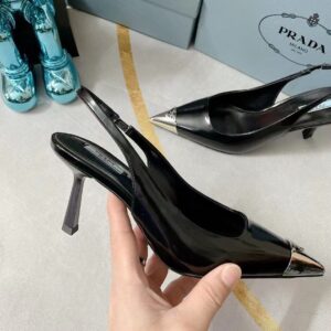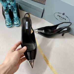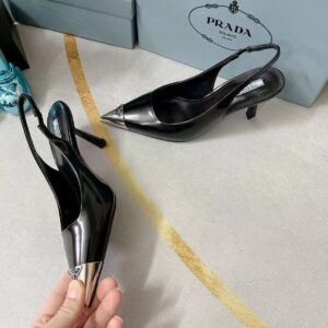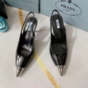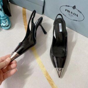 The classic slingback pump, an essential silhouette of Prada collections, is decorated with an original, luminous accent: a metal toecap embellished with the enameled metal triangle logo. An expression of a refined femininity, the brushed leather shoe plays with the iconic shape of the triangle that inspires the geometric shape of the heel for a modernist note.