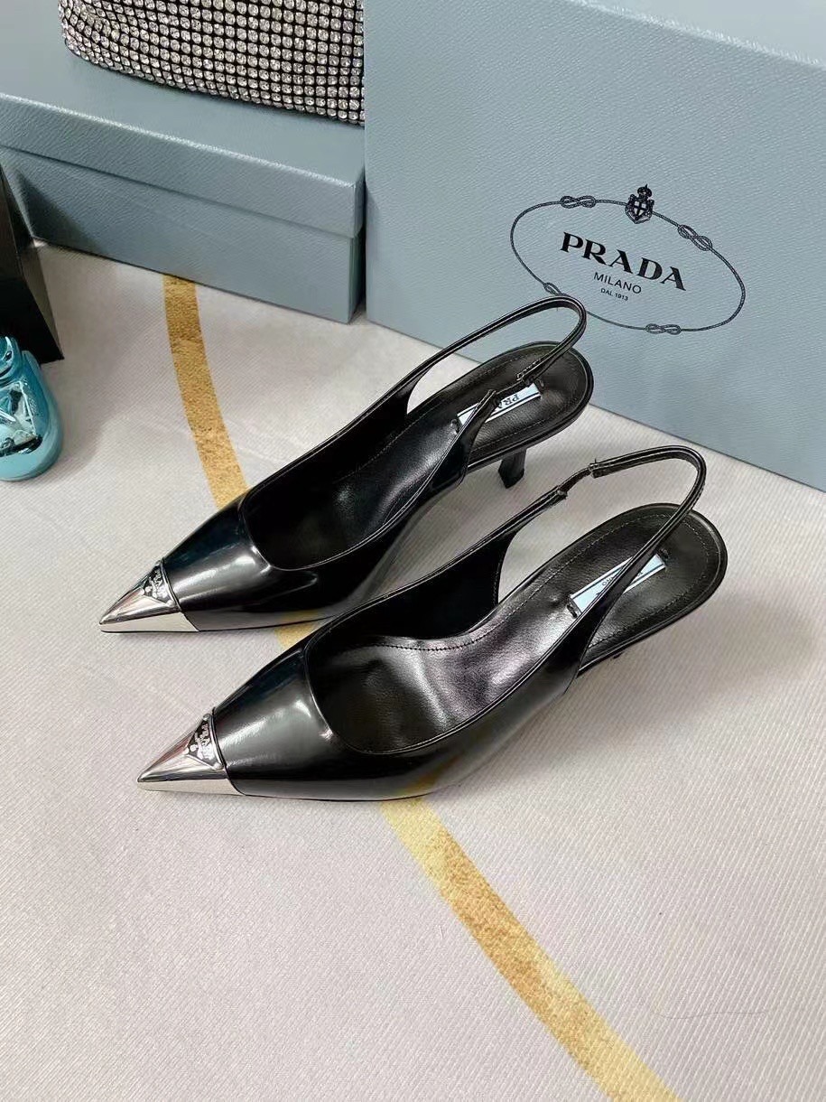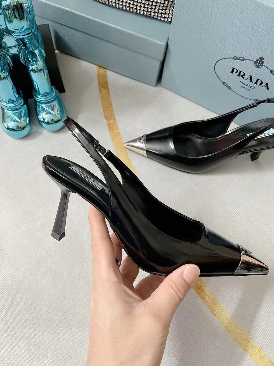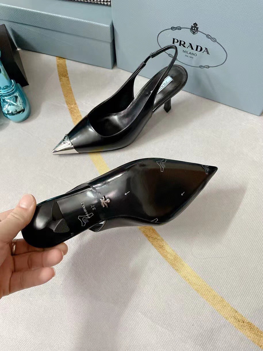 The classic slingback pump, an essential silhouette of Prada collections, is decorated with an original, luminous accent: a metal toecap embellished with the enameled metal triangle logo. An expression of a refined femininity, the brushed leather shoe plays with the iconic shape of the triangle that inspires the geometric shape of the heel for a modernist note.