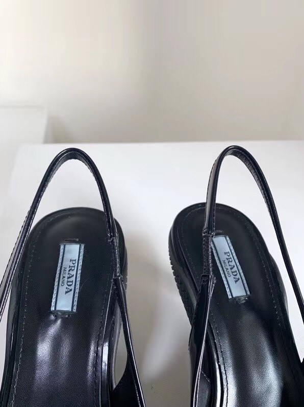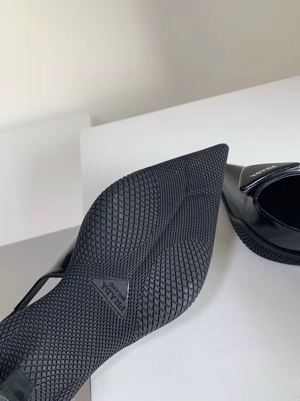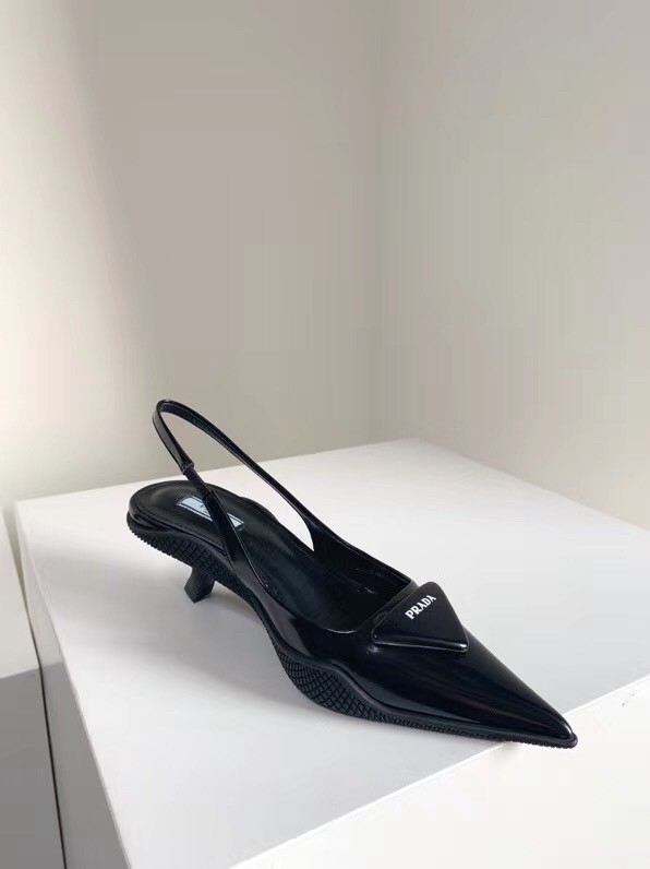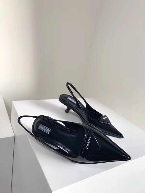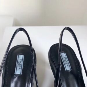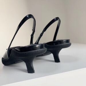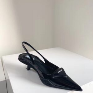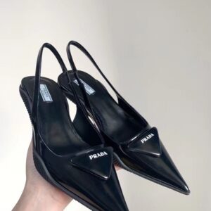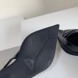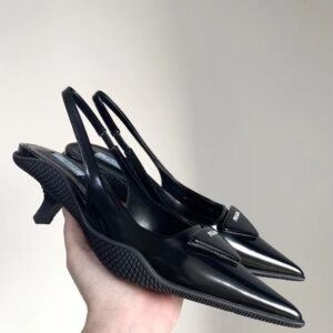 Revisiting a design from the Prada archives of the ’90s, the rubber shell sole envelops the upper of these brushed leather slingback pumps, creating a hybrid silhouette that blends a feminine pointy shape and sporty references. A distinctive element of the Spring Summer 2021 collection is the comma heel, inspired by styles from the same decade. New variations arrive for the iconic triangle, which turns into a slightly padded leather detail featuring the screen-printed Prada logo.