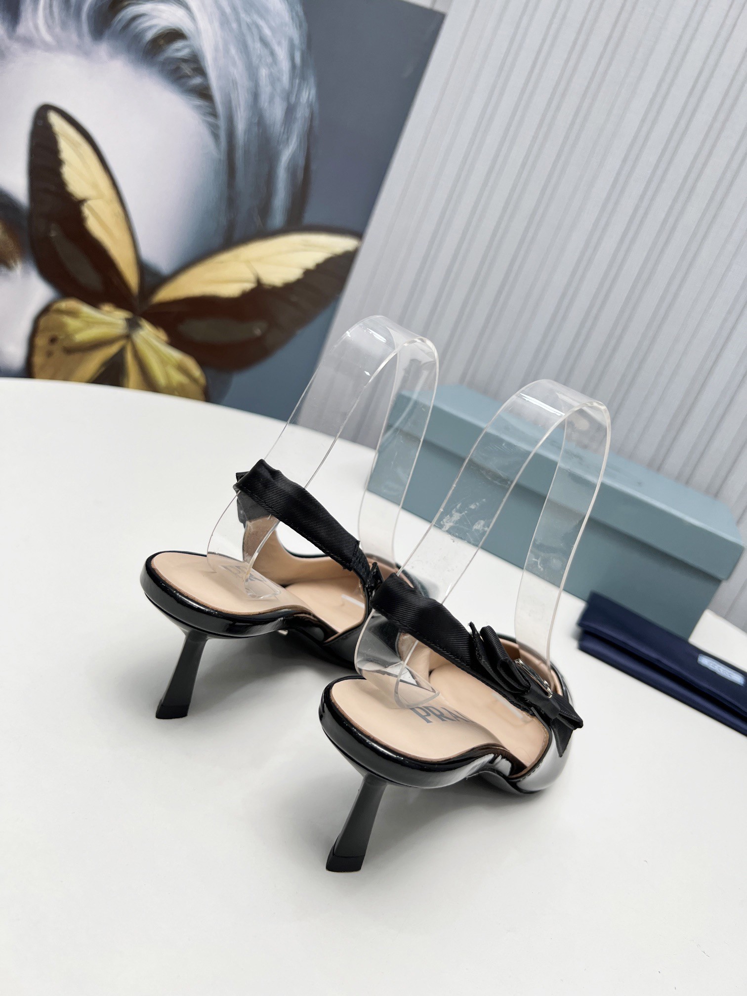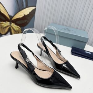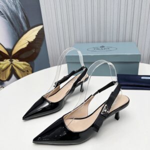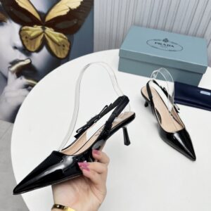 Retro allure and minimalist lines characterize these patent leather slingbacks with pointy toe. The triangle logo embellishes the elegant bow on the strap of this shoe.