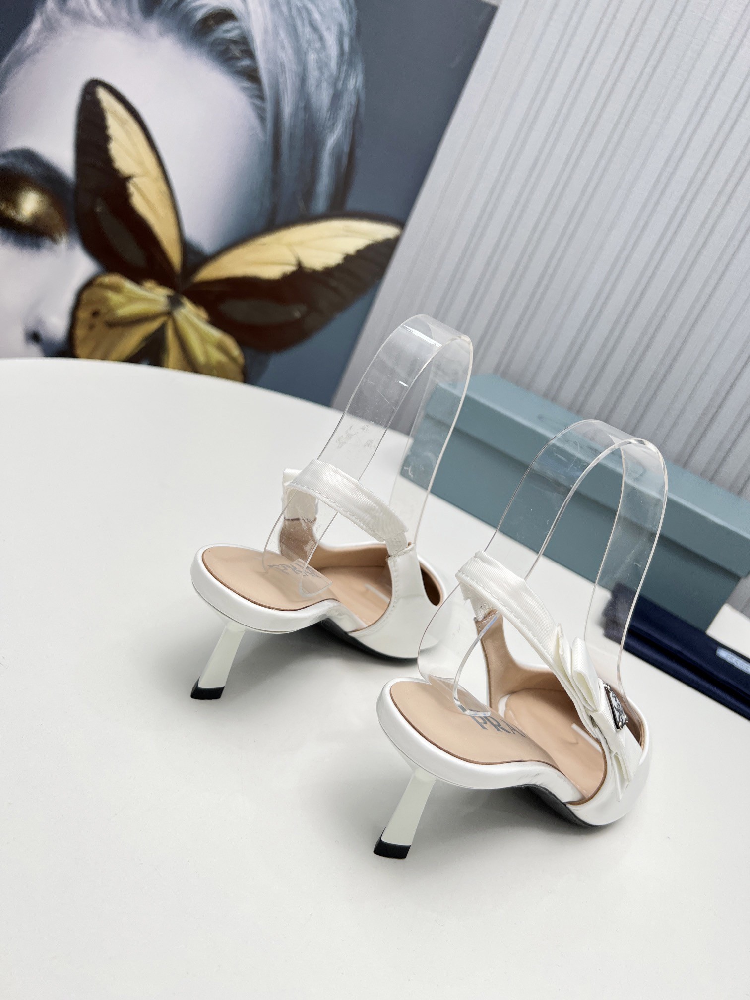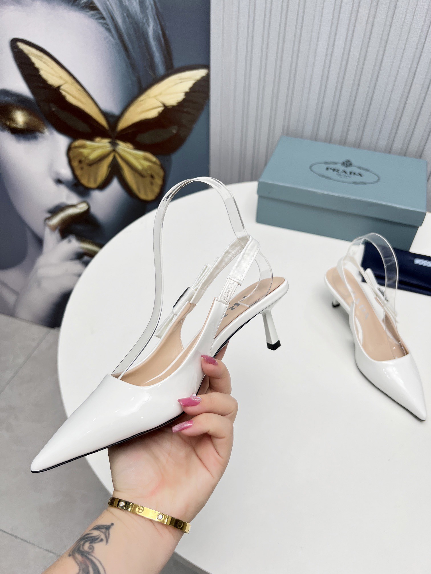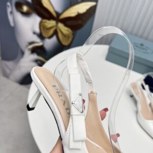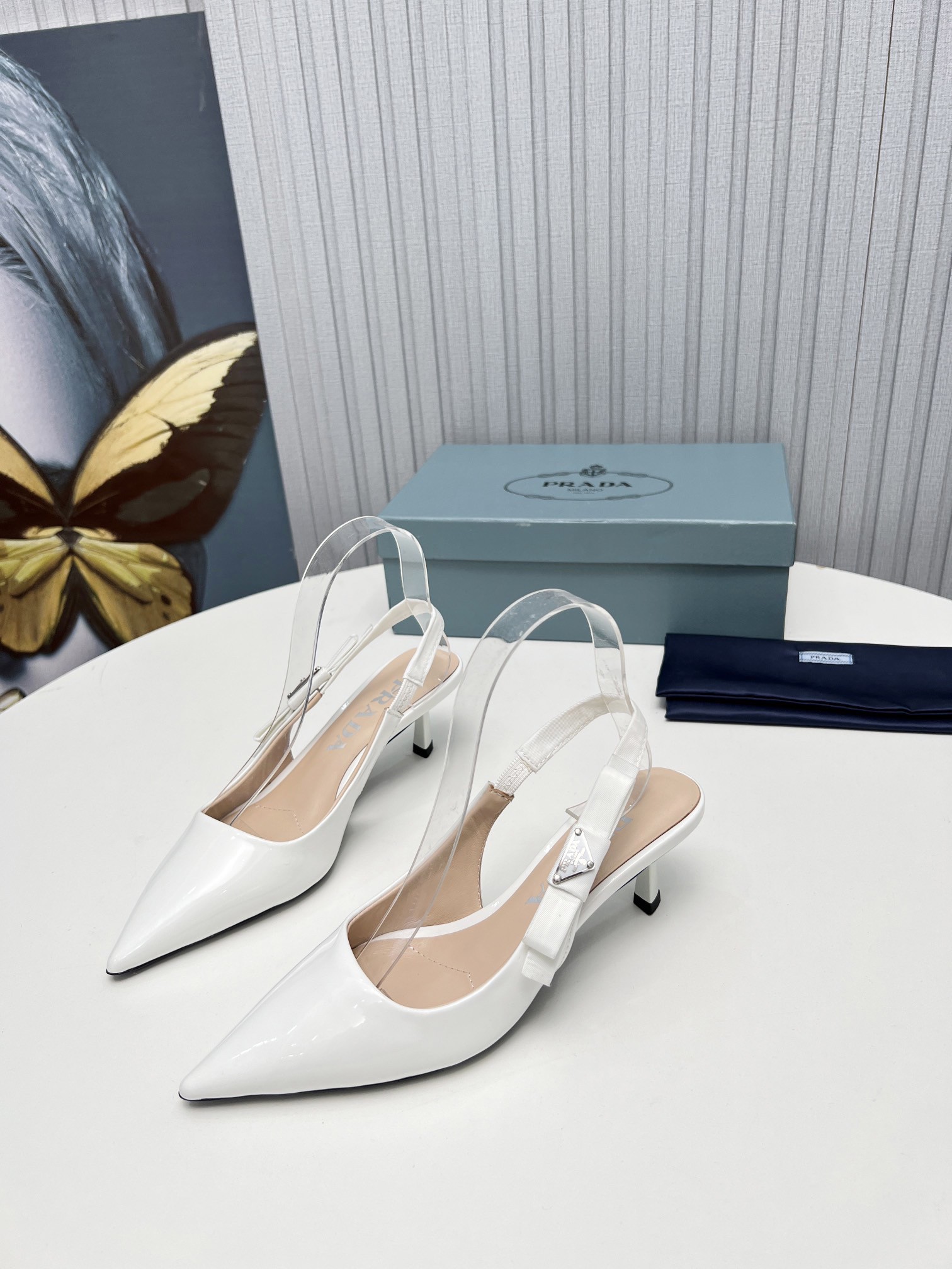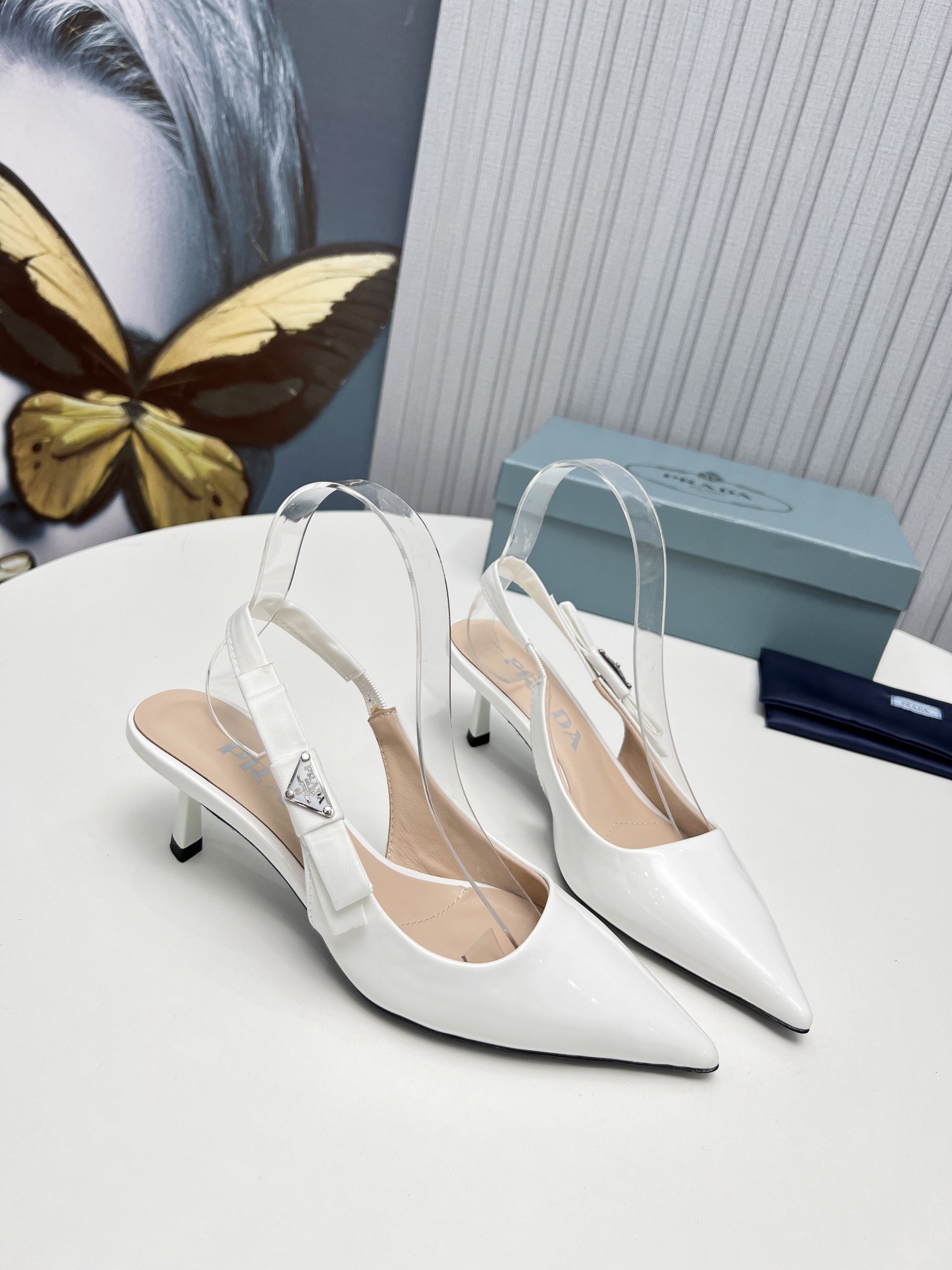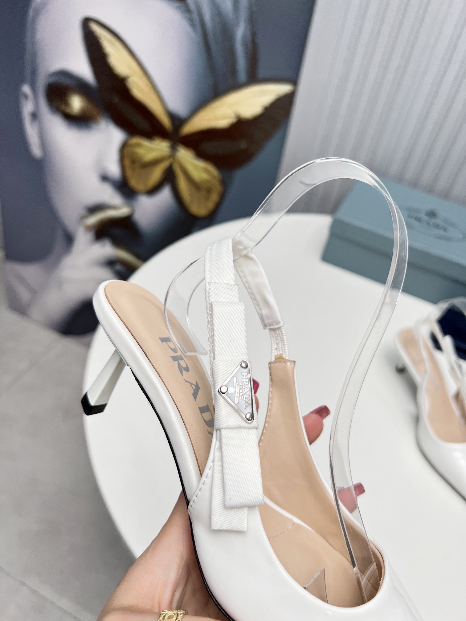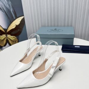 Retro allure and minimalist lines characterize these patent leather slingbacks with pointy toe. The triangle logo embellishes the elegant bow on the strap of this shoe.