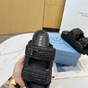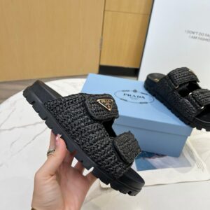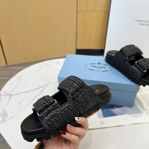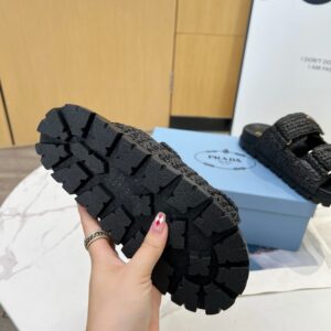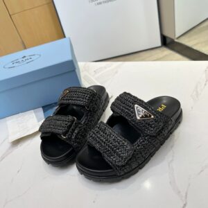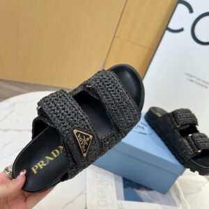 The contemporary, sporty design of these sandals is enhanced by the crochet’s texture, which evokes a summery mood, giving the design a unique touch. The versatile footwear, characterized by hook-and-loop straps and a rubber sole with lug tread, is enhanced by the enameled metal triangle logo.