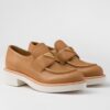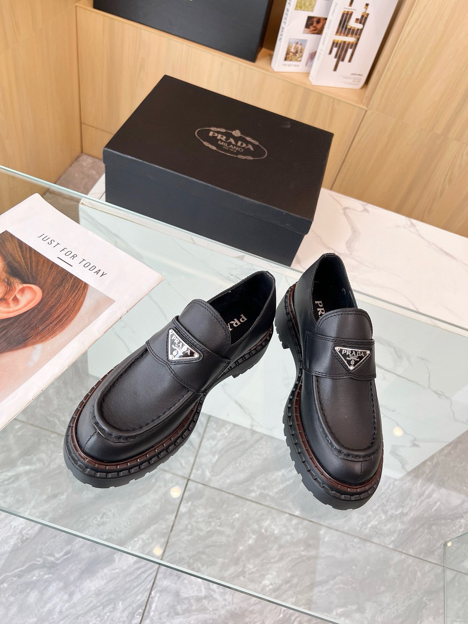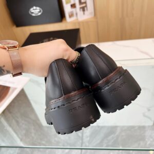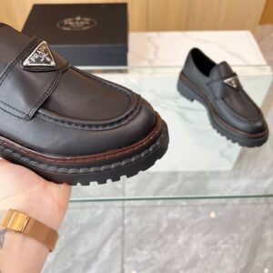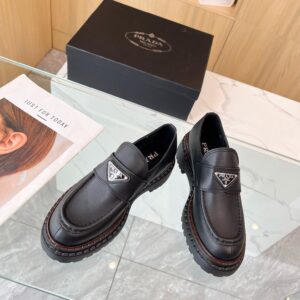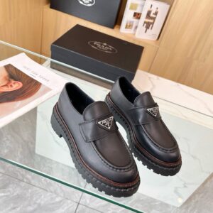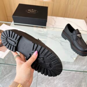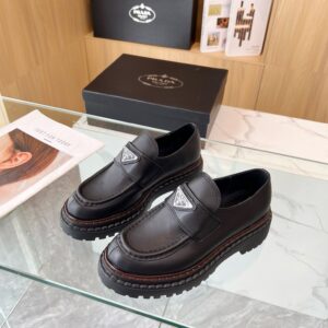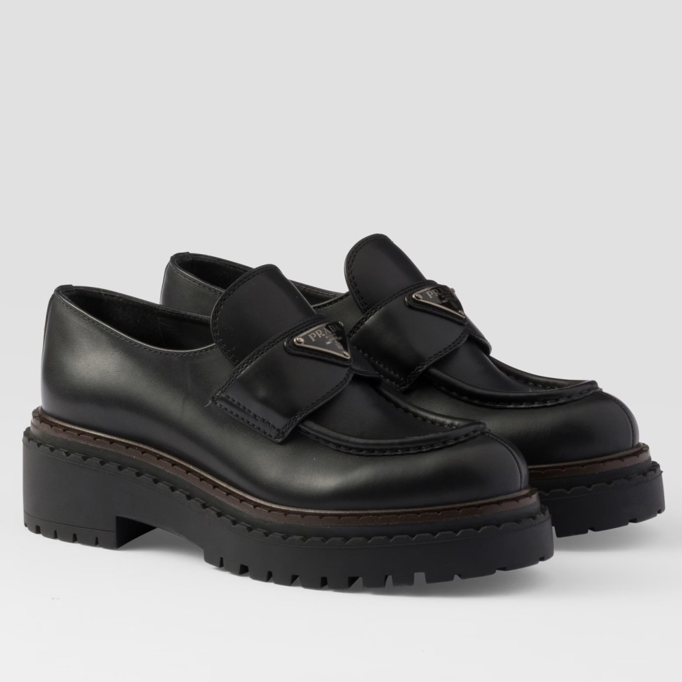 Reinterpretation of a classic men’s shoe, these leather loafers from Prada have a voluminous design and finely crafted details. The enameled metal triangle logo completes the iconic footwear.