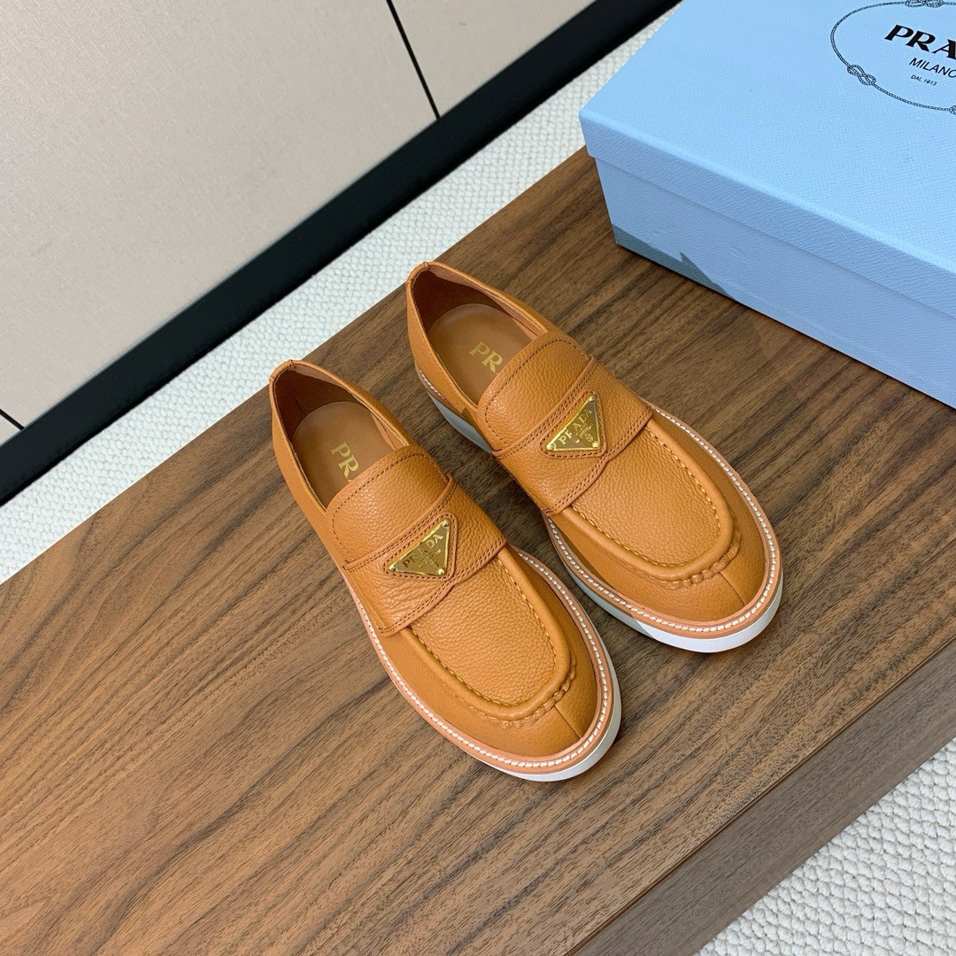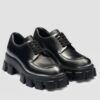 These loafers reinterpret an iconic Prada silhouette with unexpected details that express a modern attitude. The leather shoe combines timeless, classic lines with the casual touch of the monoblock rubber sole. An original mix of elegance and informal elements creates a refined, hybrid style decorated with the enameled metal triangle logo.