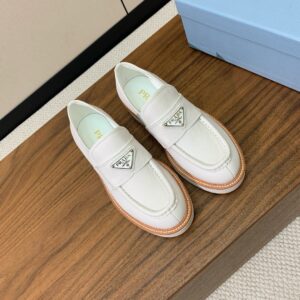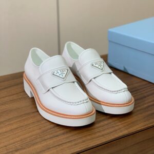 These loafers reinterpret an iconic Prada silhouette with unexpected details that express a modern attitude. The leather shoe combines timeless, classic lines with the casual touch of the monoblock rubber sole. An original mix of elegance and informal elements creates a refined, hybrid style decorated with the enameled metal triangle logo.