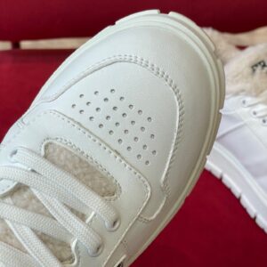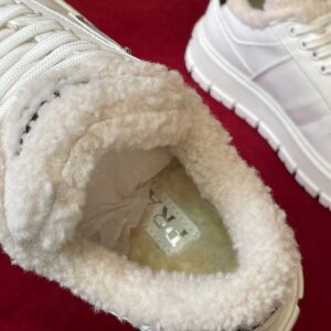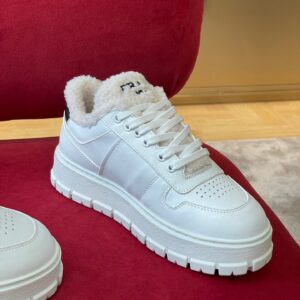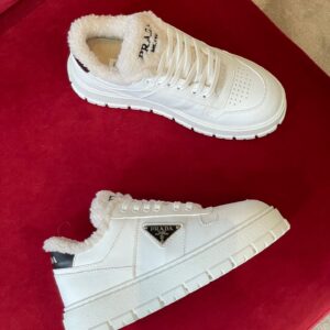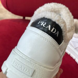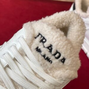 The soft shearling tongue decorated with the Prada logo is an unexpected detail that adds an original twist to these leather sneakers characterized by a sporty design with retro references.