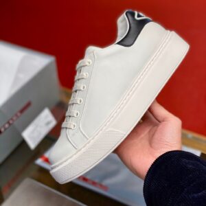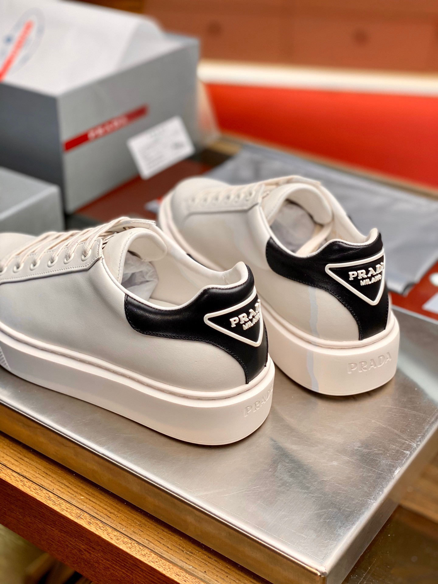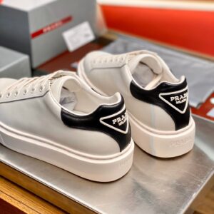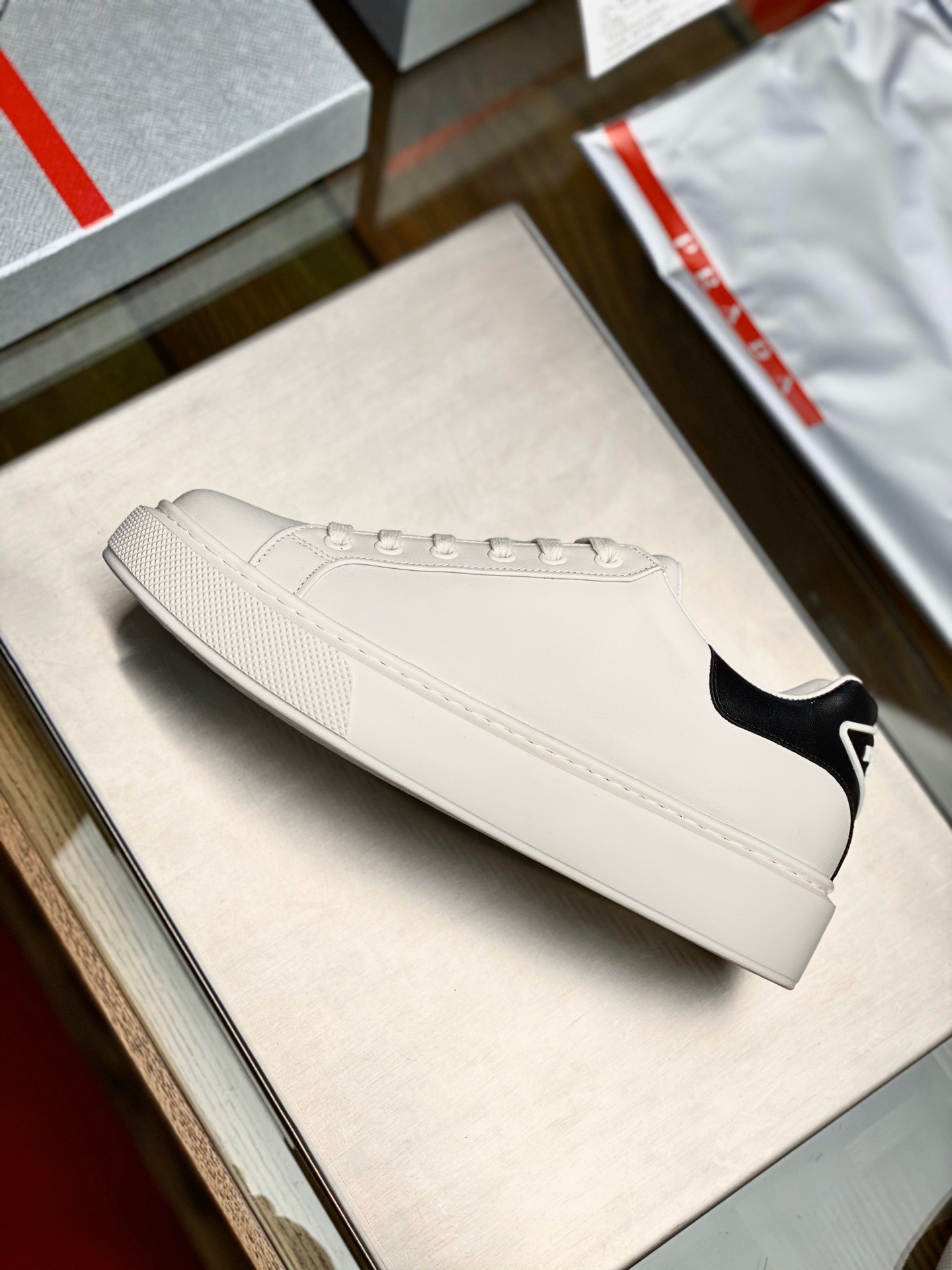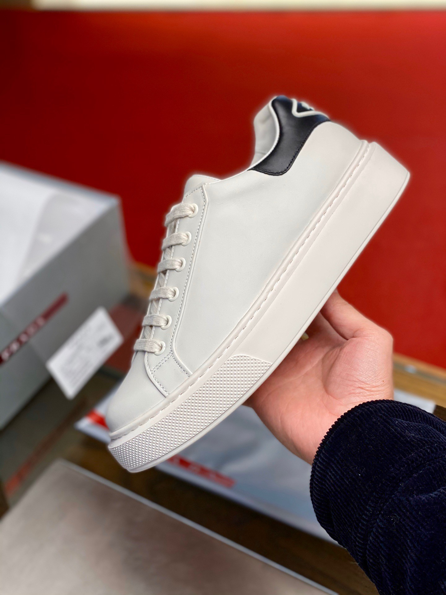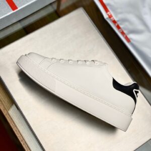 These white and black Prada Macro leather sneakers have a low top silhouette and chunky rubber soles. Accented with contrasting heel counters and triangular logos, they have round toes, lace-up fastenings and embossed branding on the tongues. Take the name of these Prada sneakers as a cue for the sizable positive impact they’ll have on your wardrobe.