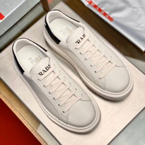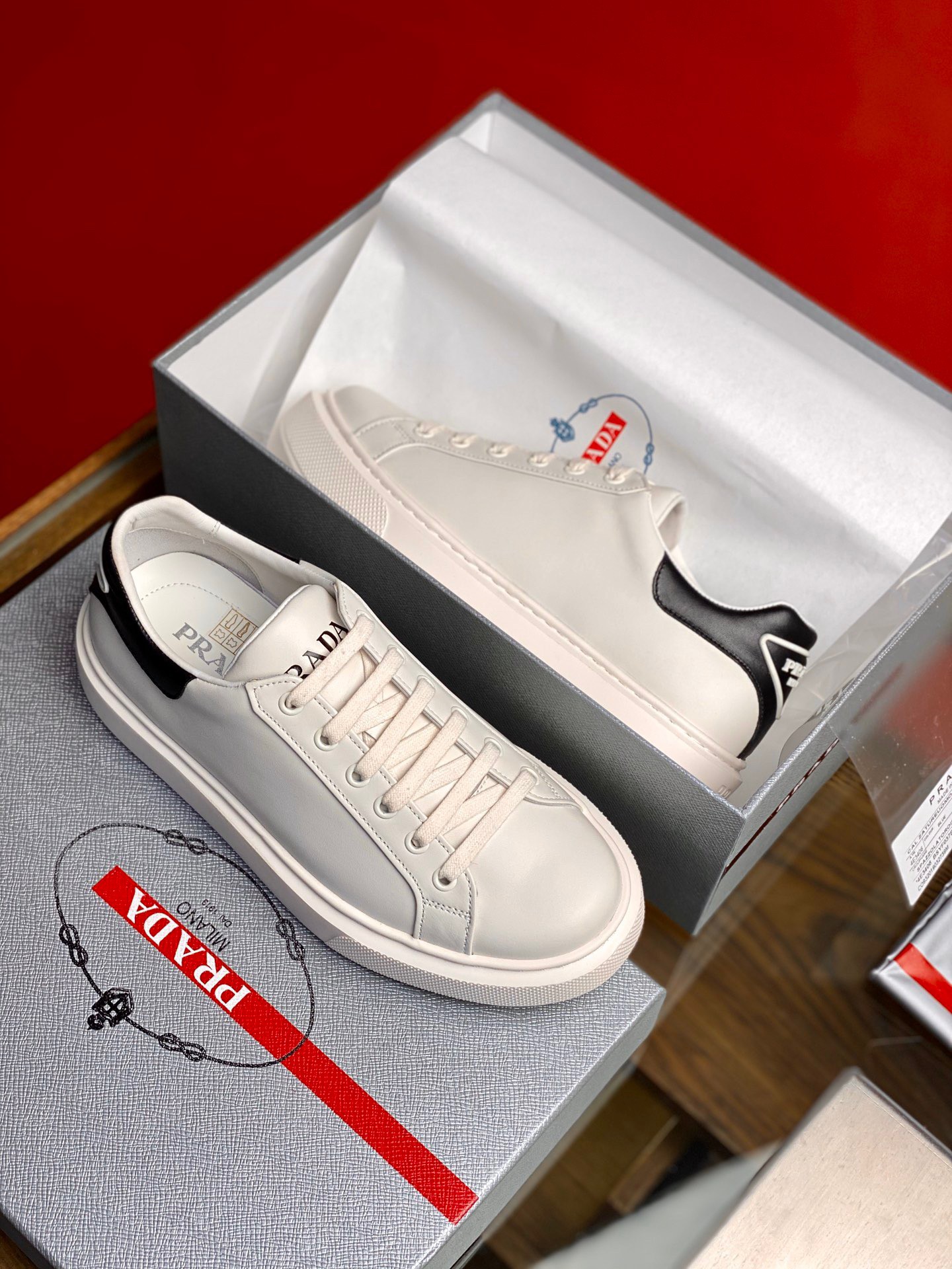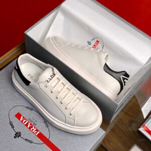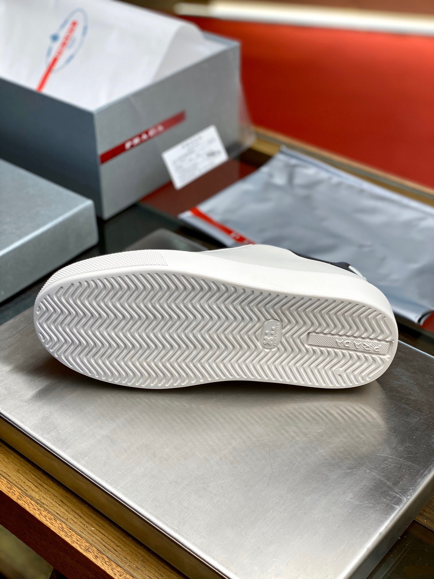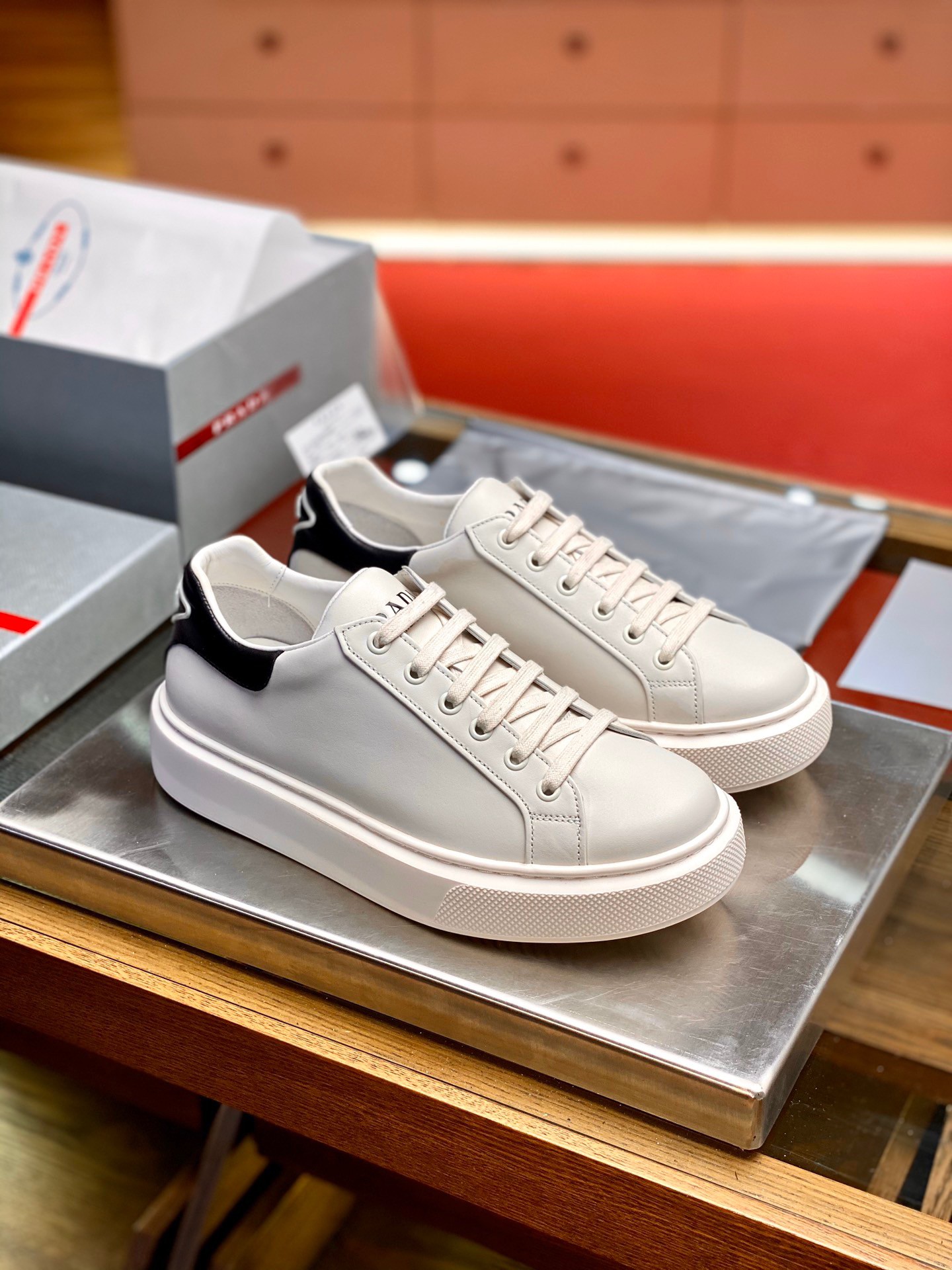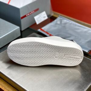 These white and black Prada Macro leather sneakers have a low top silhouette and chunky rubber soles. Accented with contrasting heel counters and triangular logos, they have round toes, lace-up fastenings and embossed branding on the tongues. Take the name of these Prada sneakers as a cue for the sizable positive impact they’ll have on your wardrobe.