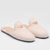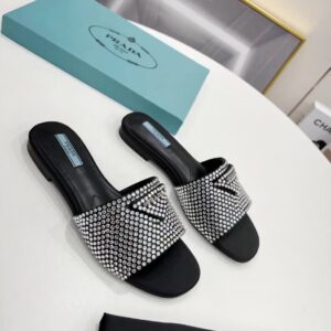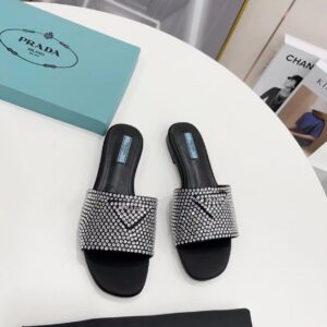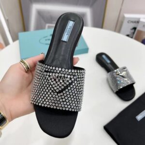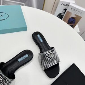 Faceted crystals create plays of light and iridescent reflections on these flat slides in a luxurious version. The hybrid concept pervades the Prada narrative and is translated into innovative designs with an interesting and unusual combination of materials, shapes, and functions. New variations of the brand’s iconic triangle logo turn it into a slightly padded leather detail.